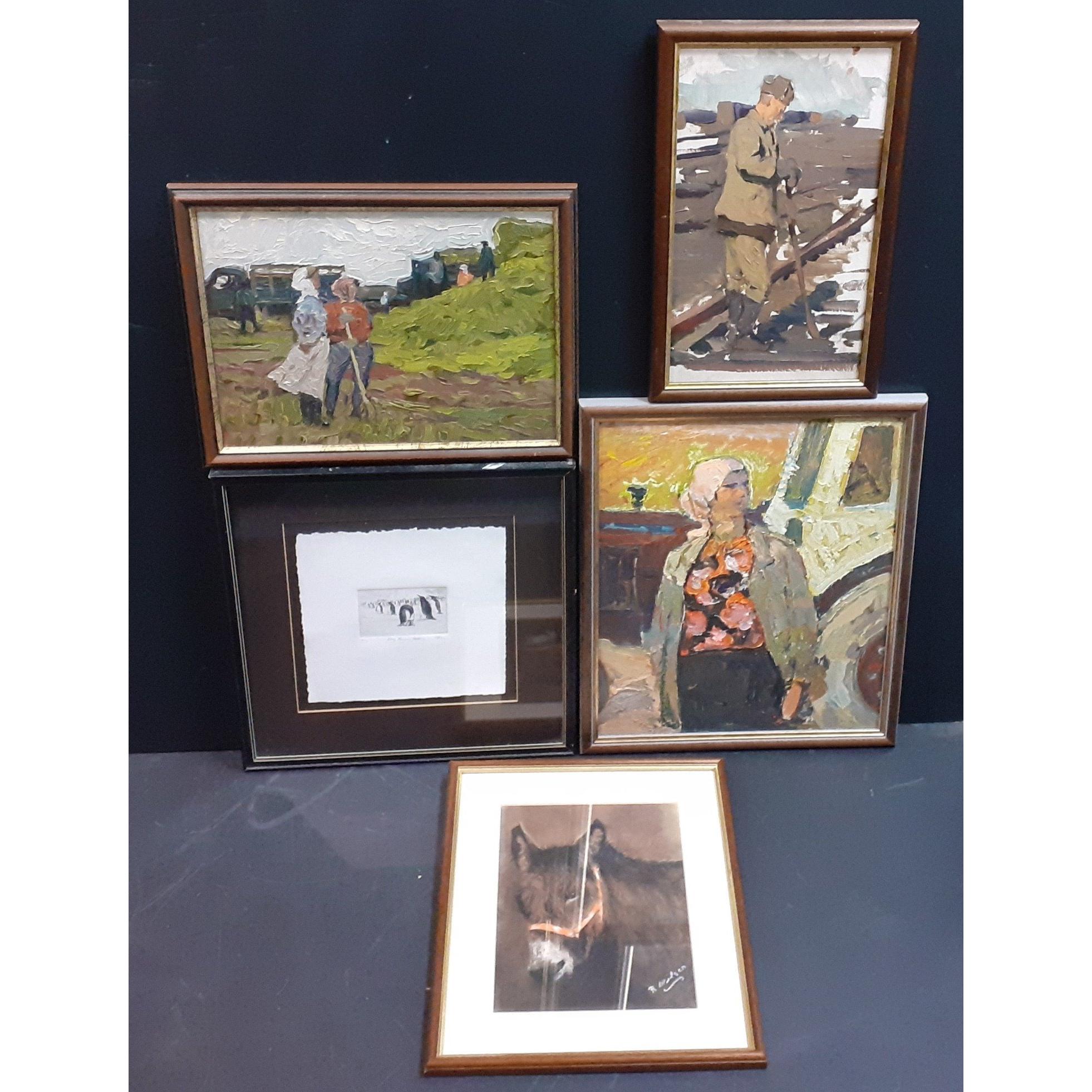 A selection of interesting art work pieces to include, penguin etching limited edition, pastel picture of a donkey by R. Wilson, three pictures of Russian workers, agricultural and industrial.
