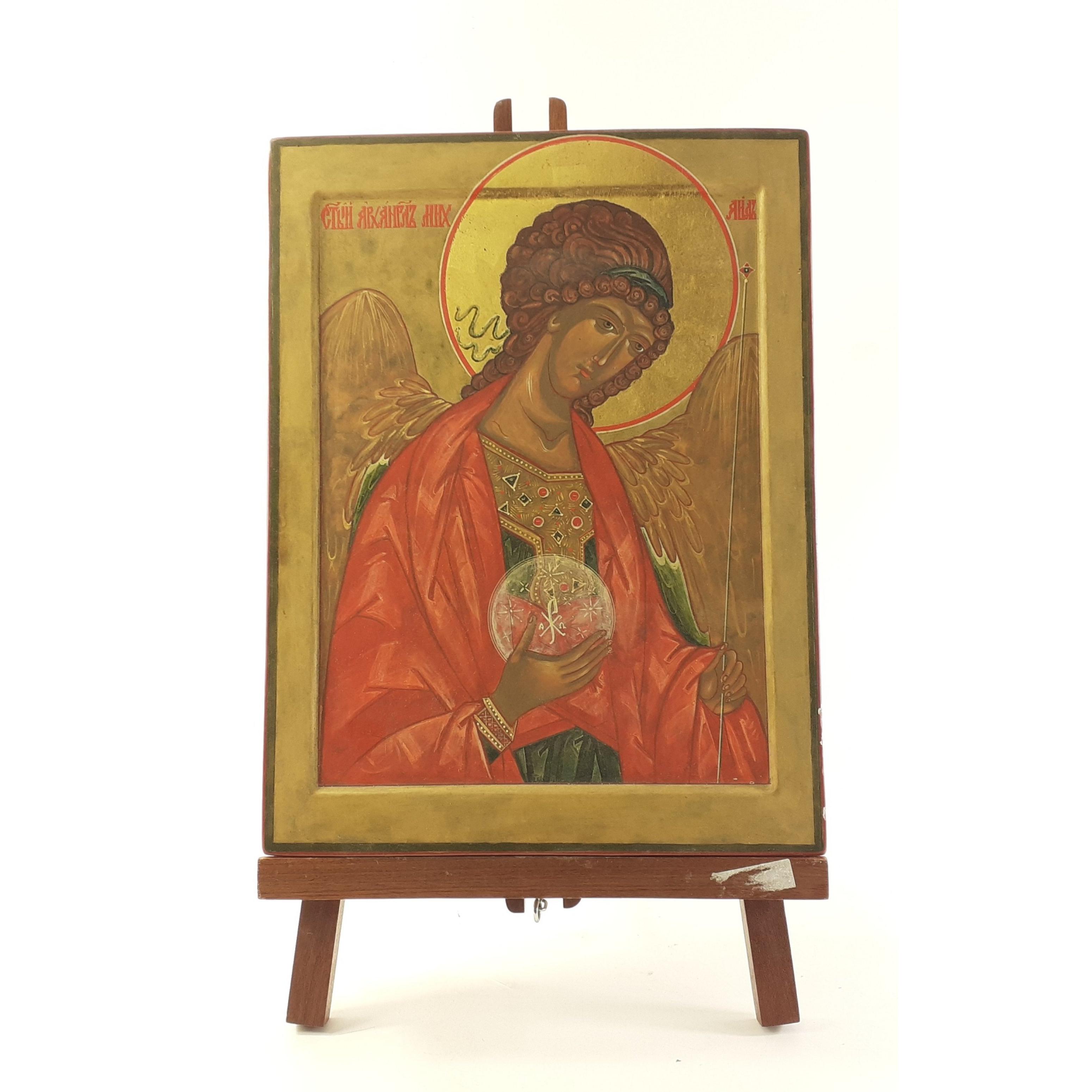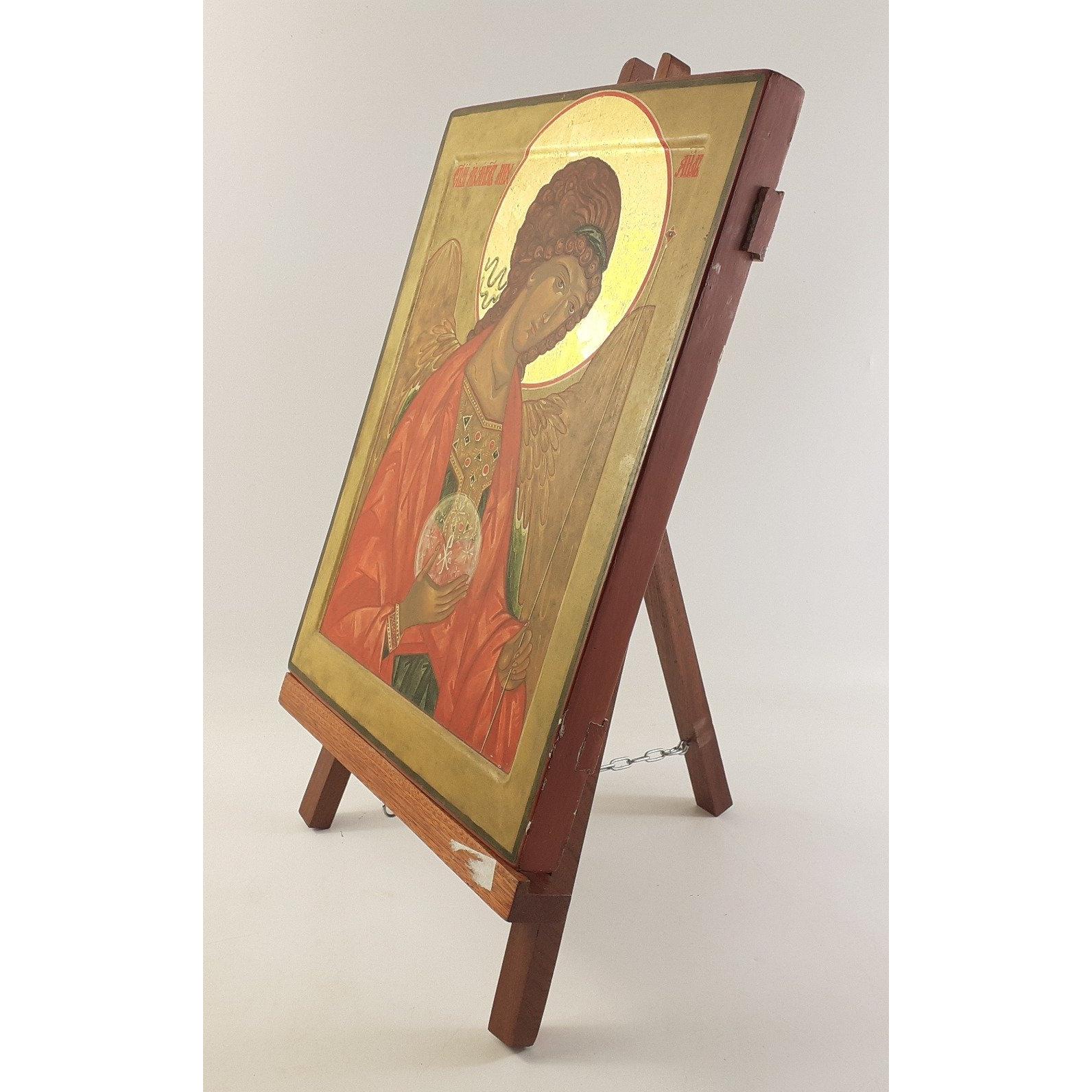Russian style devotional icon type painting on tripod stand. 38 x 29cm.