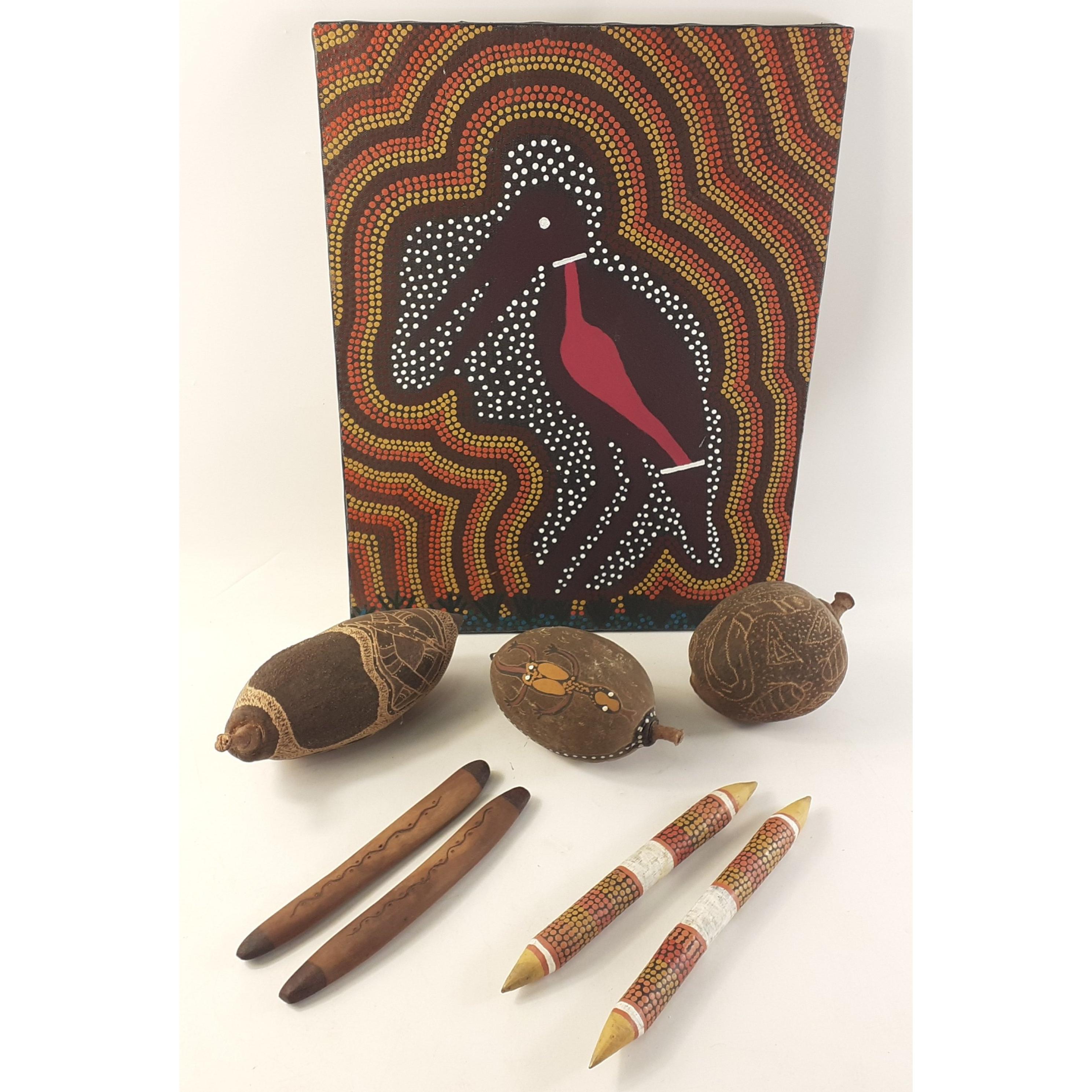Intriguing little lot of Australian Aboriginal pieces of interest to include three decorated Baobab Nuts and two pairs of decorated talking sticks. Also a rather attractive Brolga Aboriginal painting on canvas by GRAHAM FIREBRACE of Hastings, Victoria, Australia. 45 x 35cm approx.