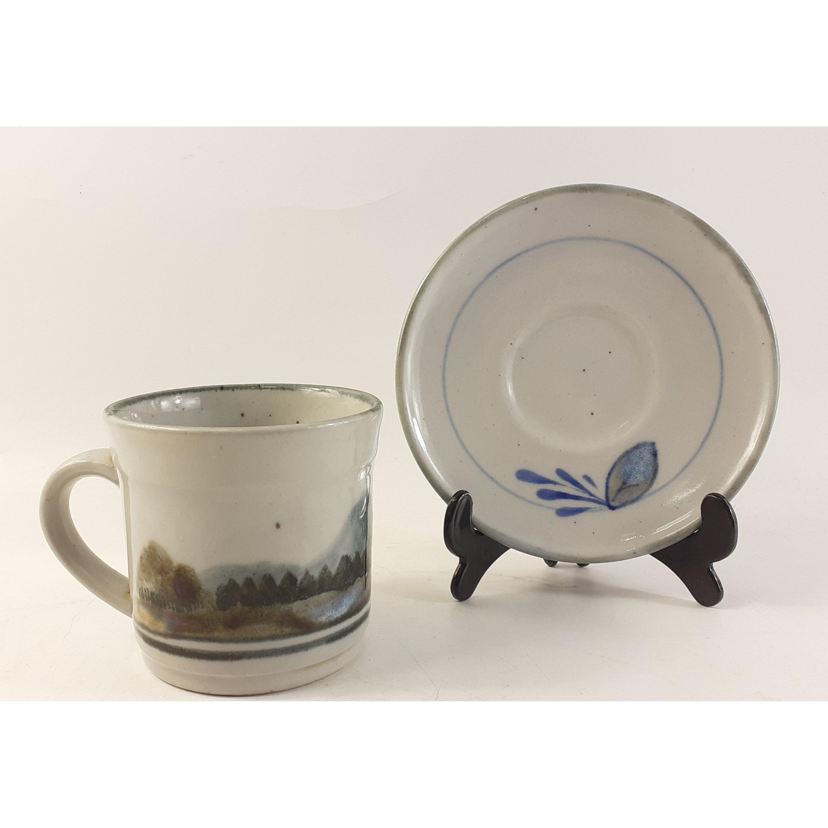 A large HIGHLAND STONEWARE mug 9cm tall, and a HIGHLAND STONEWARE saucer. Note minor chip to mug rim.