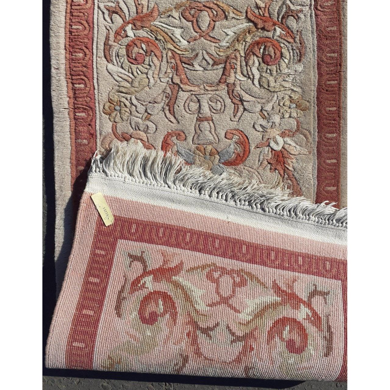 A useful CHINESE wool rug with fringe and pink theme. 140 x 60cm approx.