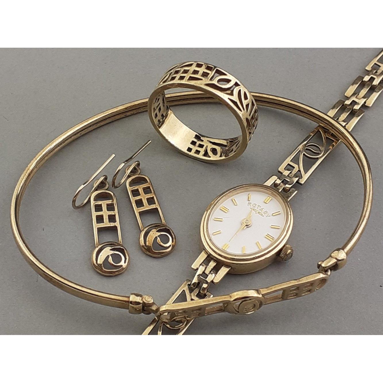 CHARLES RENNIE MACKINTOSH gold jewellery collection to include a lovely bracelet with full 375 hallmarks 3.95g approx, matching ring size P, 3g approx, earrings 1.4g approx. and a fully hallmarked rosary watch with gold bracelet. 8.4g approx in gold PLUS the watch