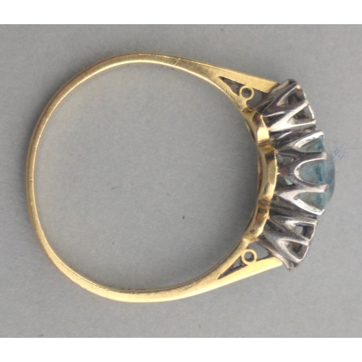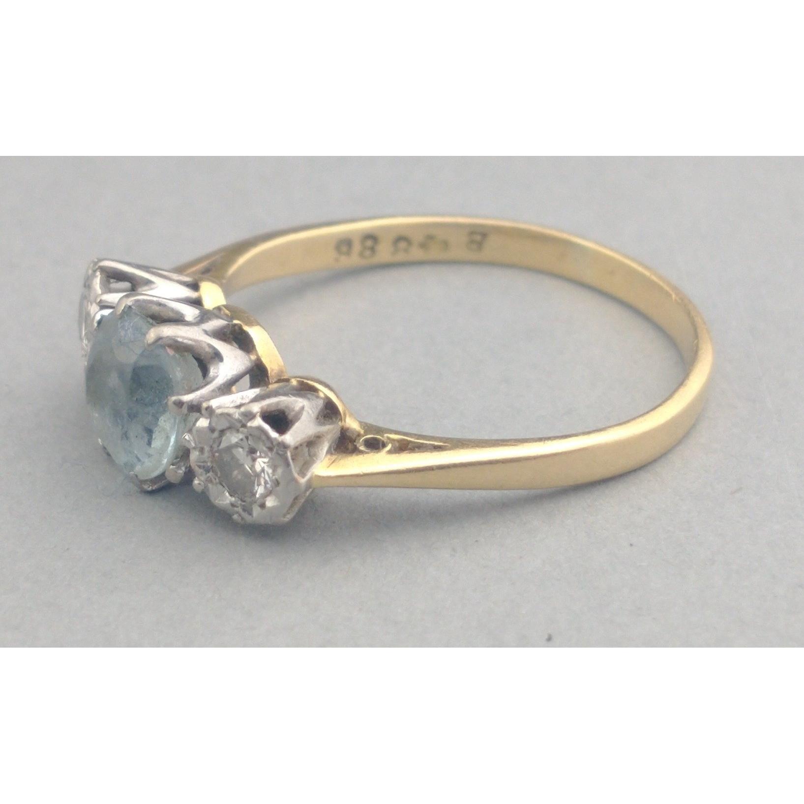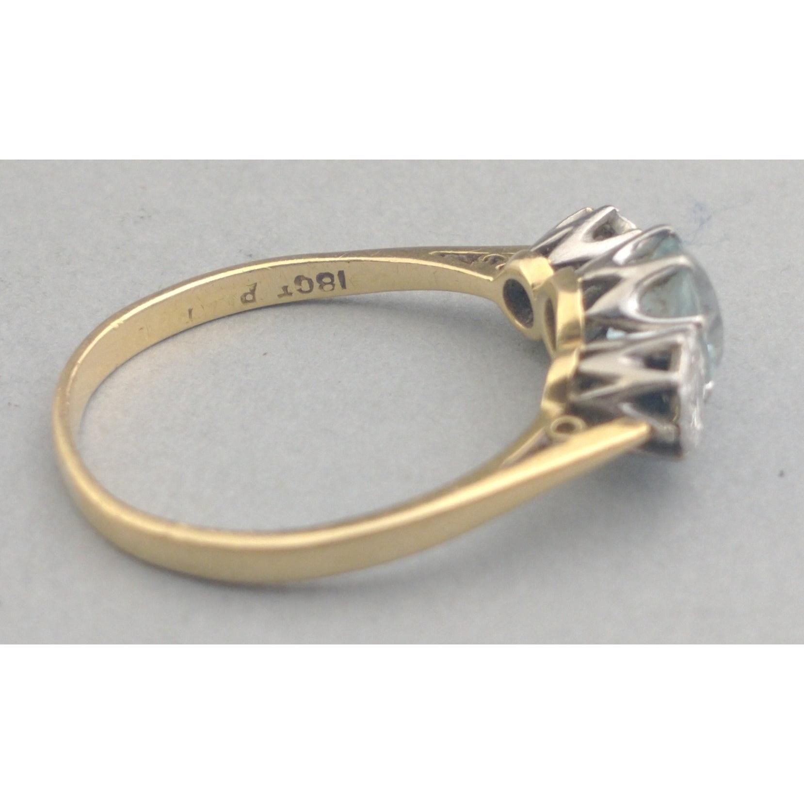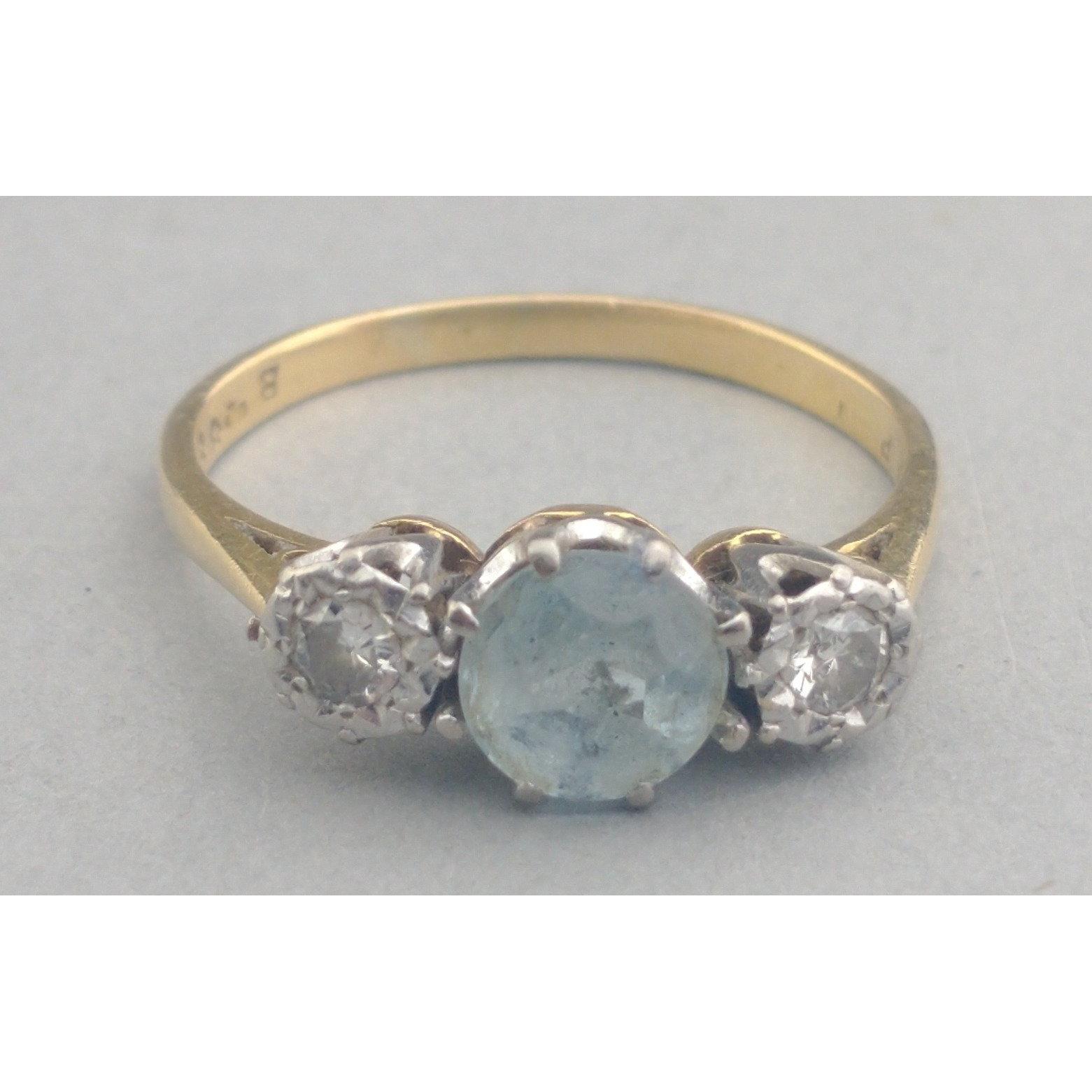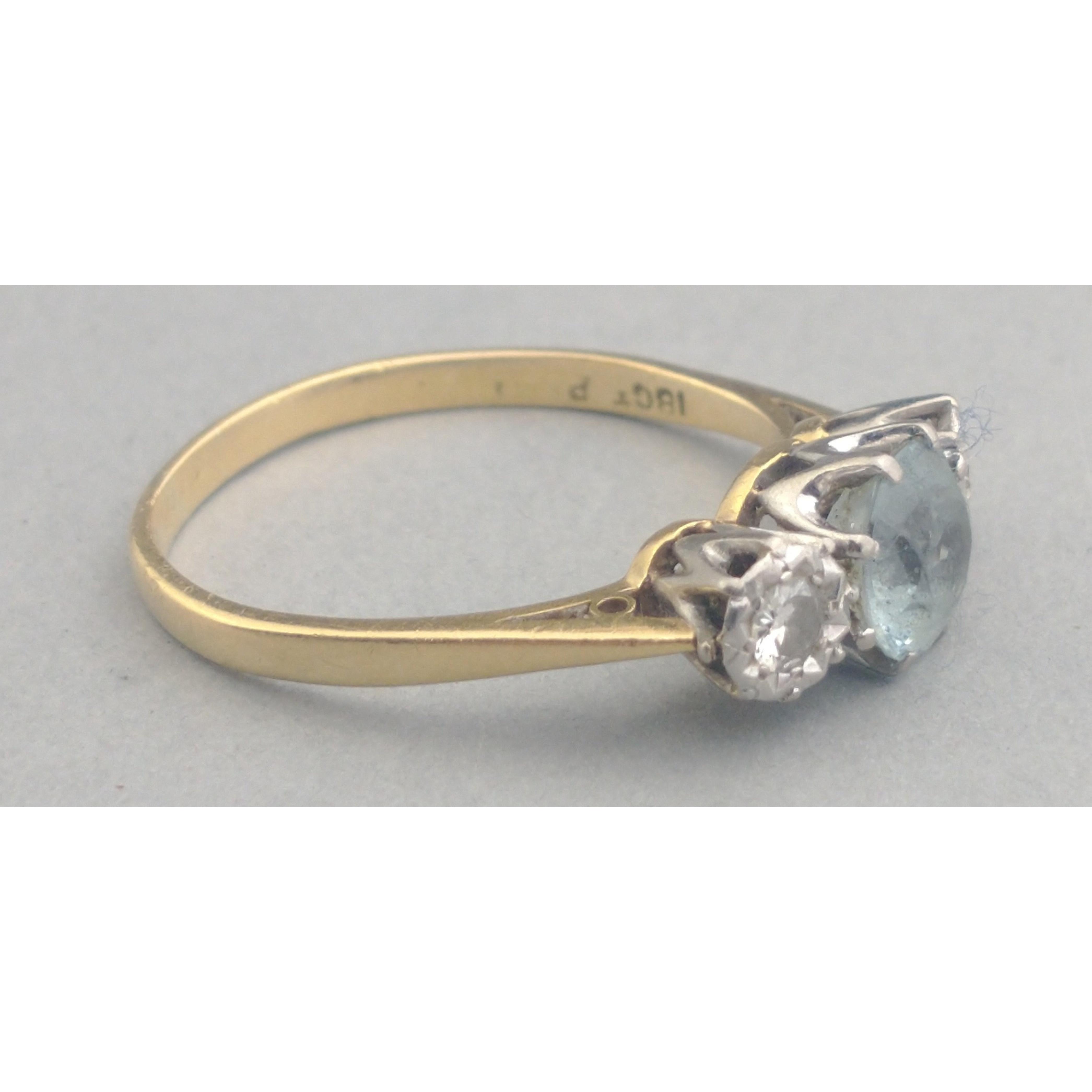 An 18ct and platinum band with twin diamonds and aquamarine. Diamonds each measuring 2mm approx. A lovely classic piece. Size S, gross weight 3.2g approx.