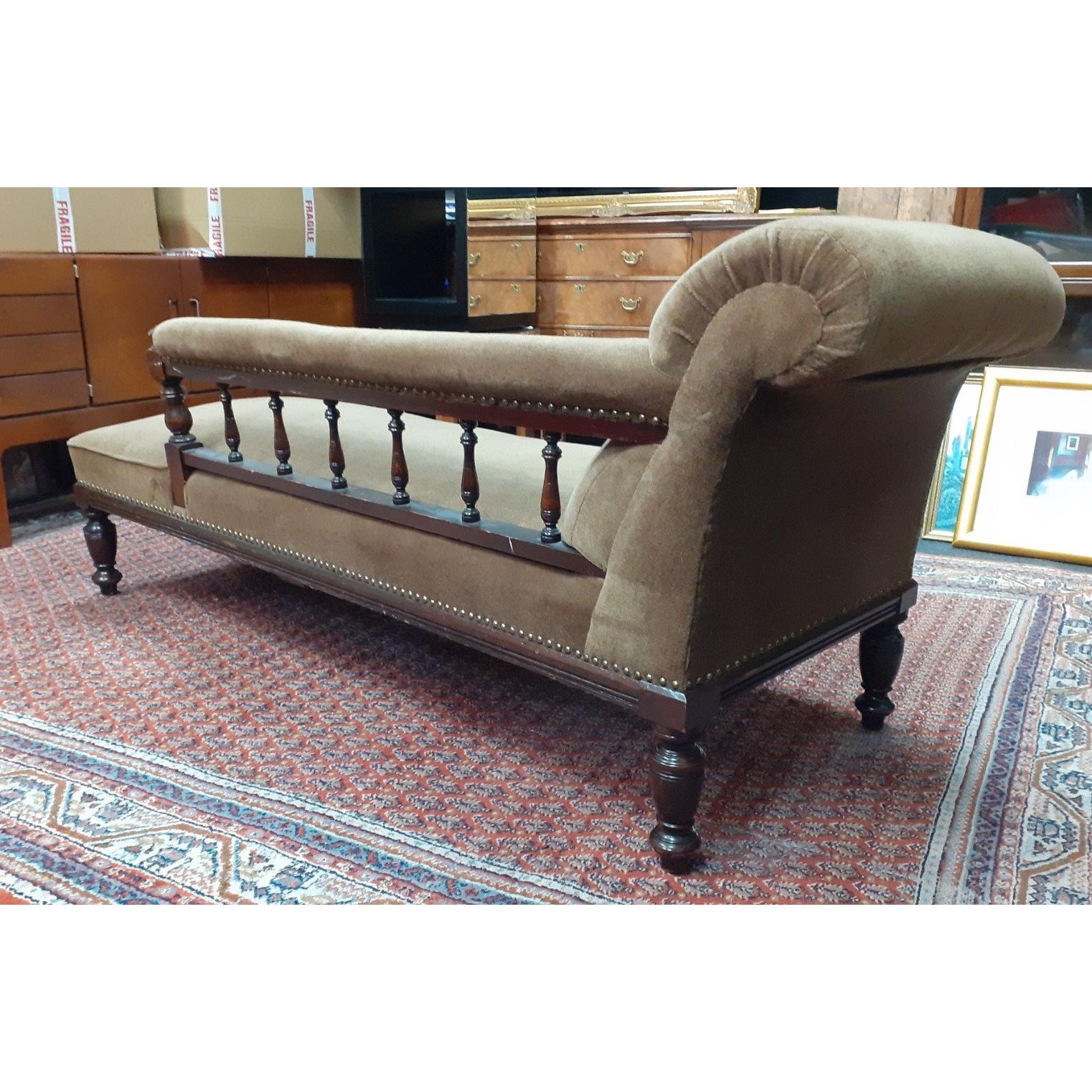 A chaise longue in nut brown fabric, height 70cm to top of back and length 155cm approx