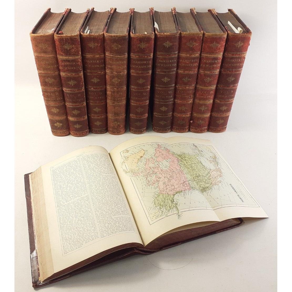 CHAMBERS ENCYCLOPAEDIA 1904 in ten volumes. Internally good with fold out maps etc. external covers with rubbing.Approx 10 pieces