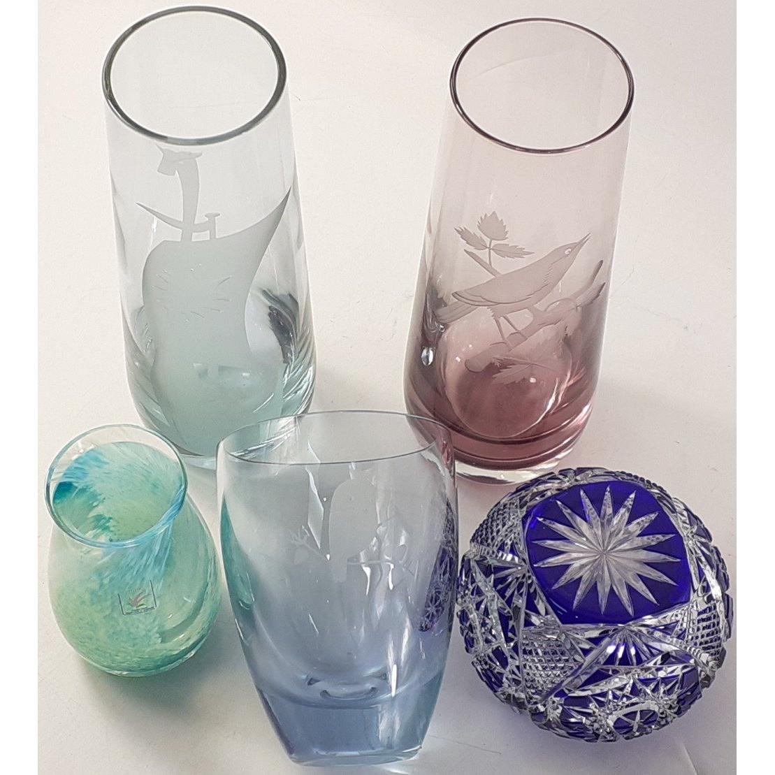 Five pieces of glassware to include 2 purple vases, one titled 'Nightingale', the other with an etching of a Viking longship, both 23cm tall, one other purple vase 13cm tall approx with an etching of an owl, a CAITHNESS swirl pattern vase 11cm tall and a blue and clear glass bowl 10cm tall approx