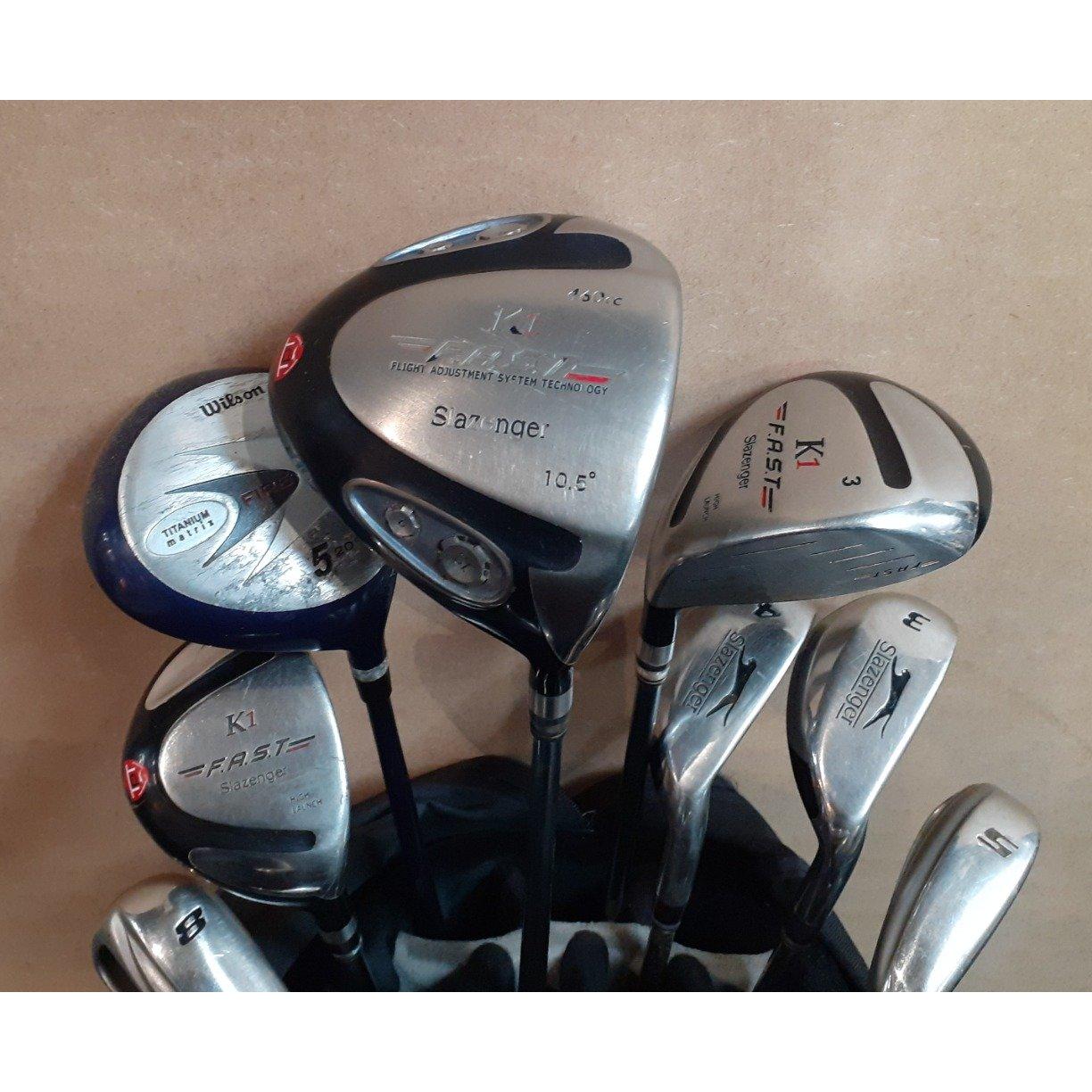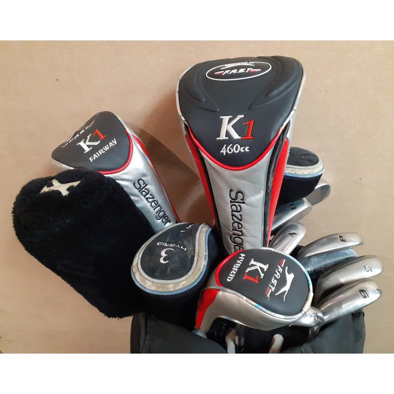 GOLF CLUBS. A set in bag to include SLAZENGER woods and irons. Including KI Driver. In used good condition.