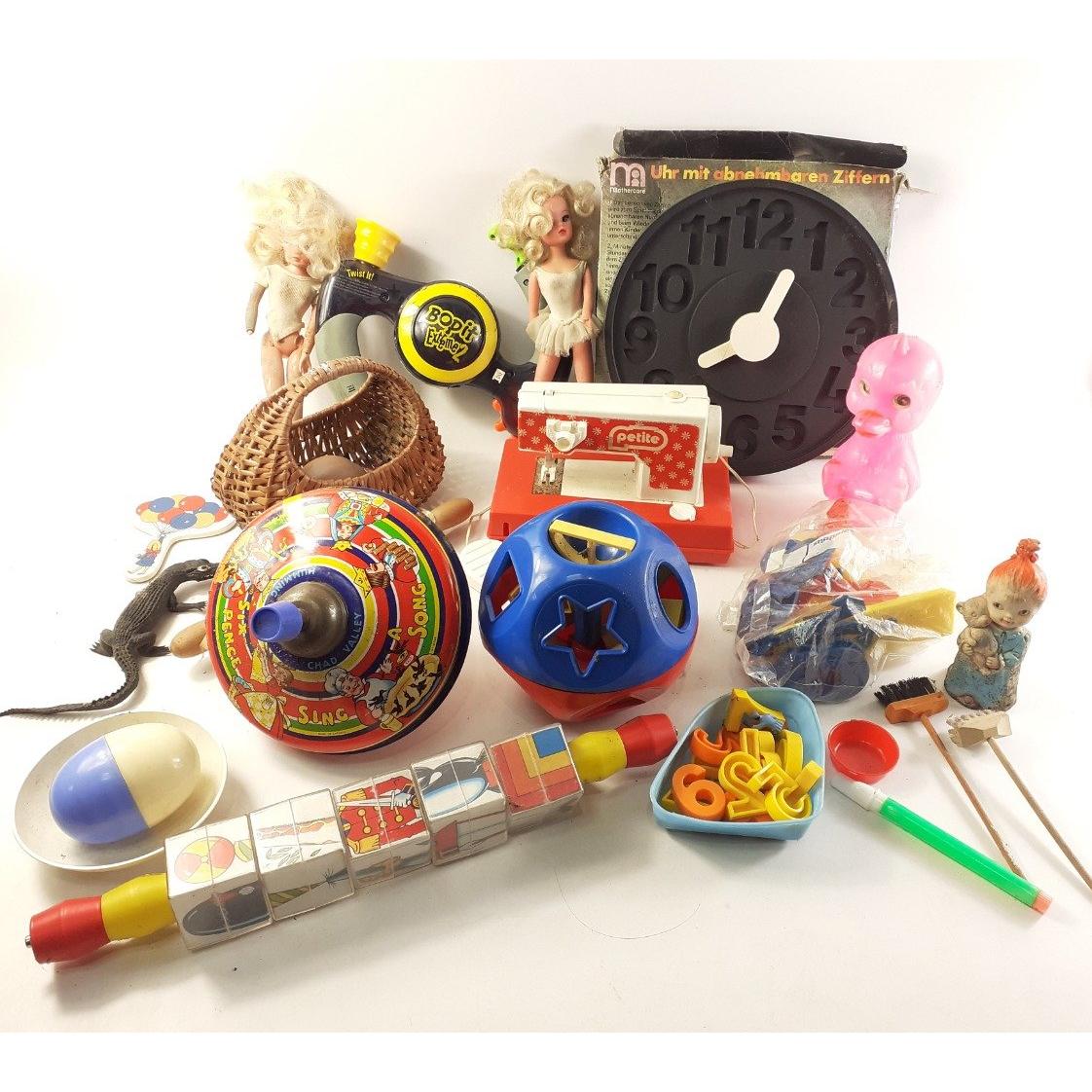 Two boxes of toys includes dolls, Mickey Mouse wooden hanger, spinning top, Toots doll etc.
