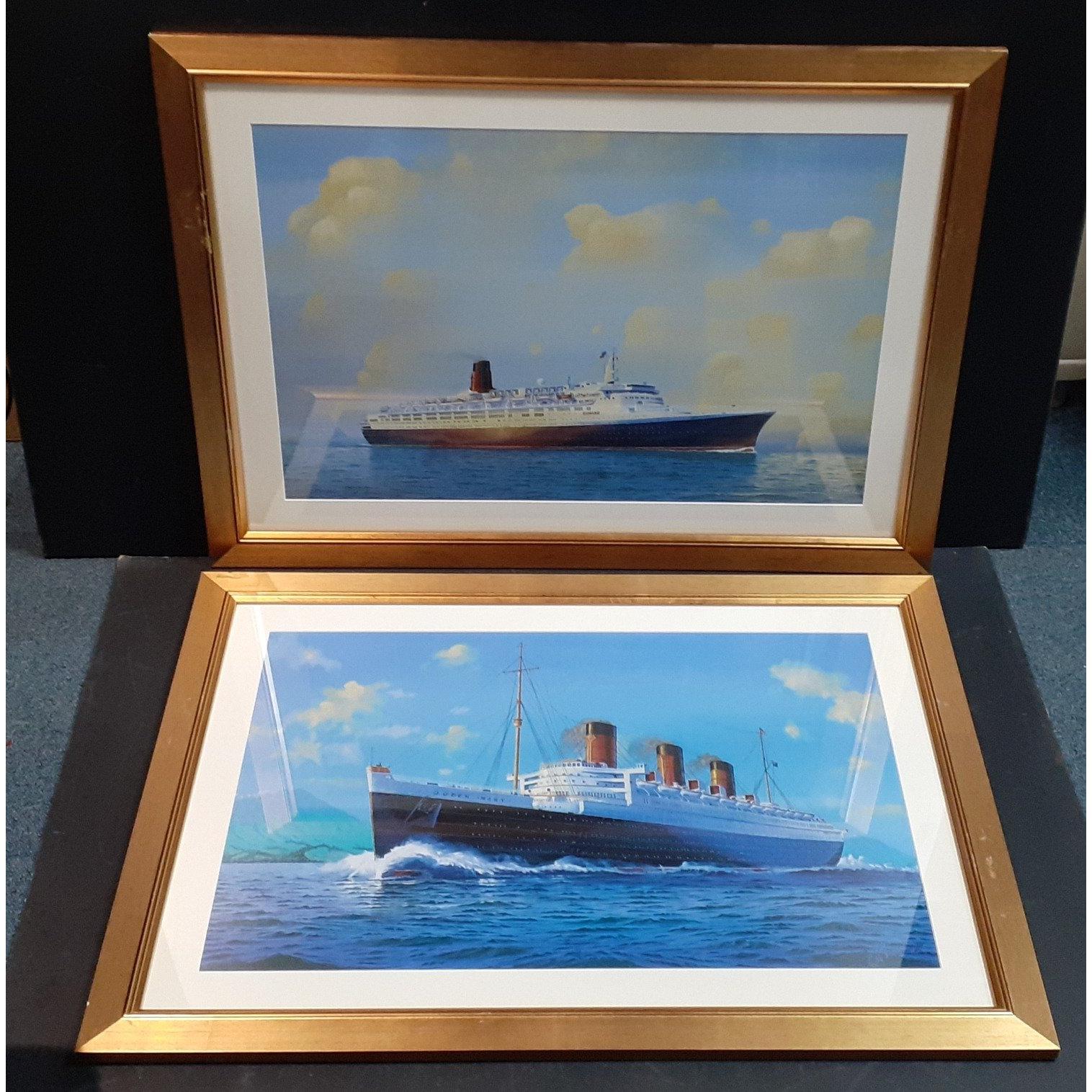 Two large framed prints of ocean going liners. THE QUEEN MARY & QUEEN ELIZABETH II. Each frame 89cm x 64cm approx. Both in lovely condition. Approx 2 pieces