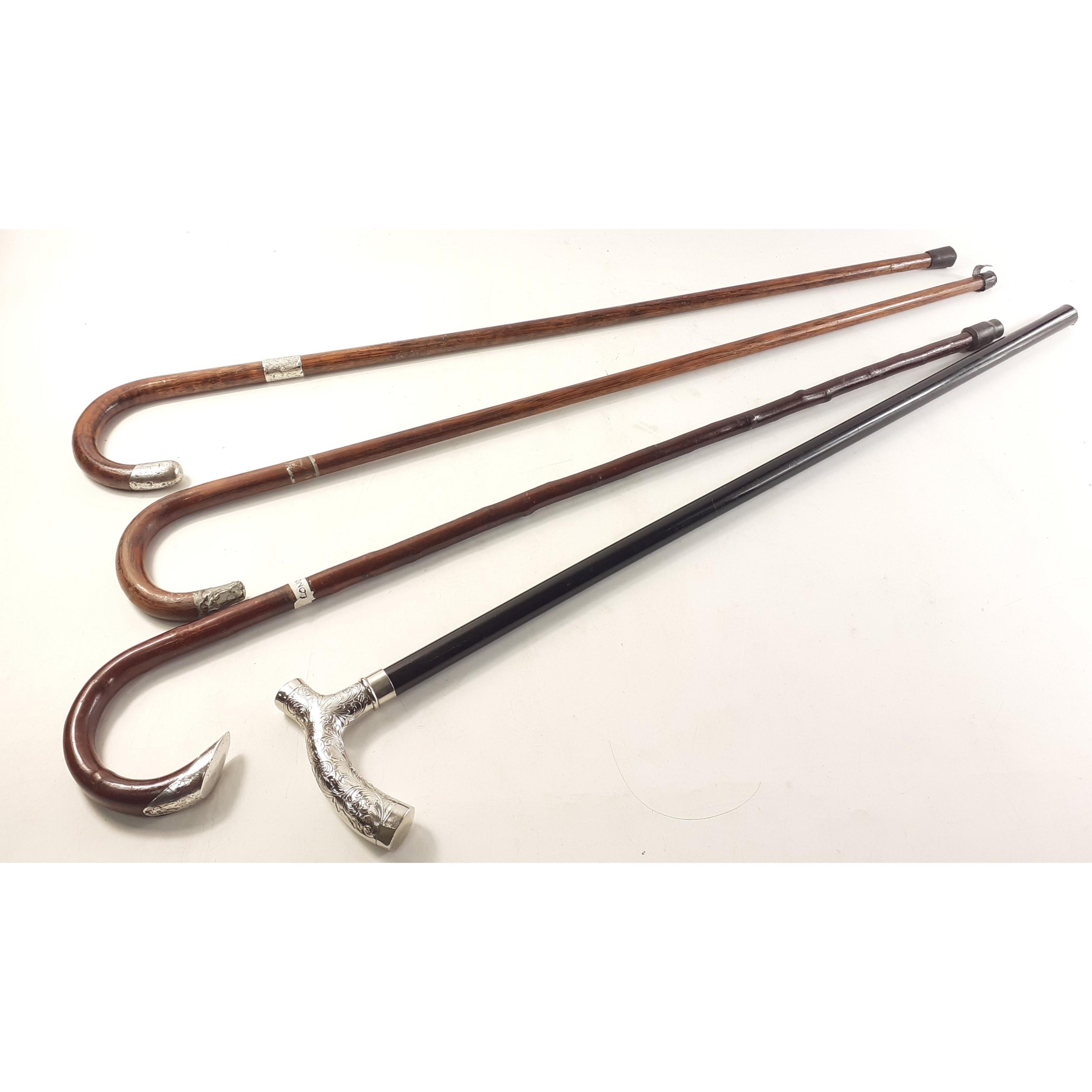Four super walking sticks to include two with silver mounts. One modern silvered cane plus one other.Approx 4 pieces