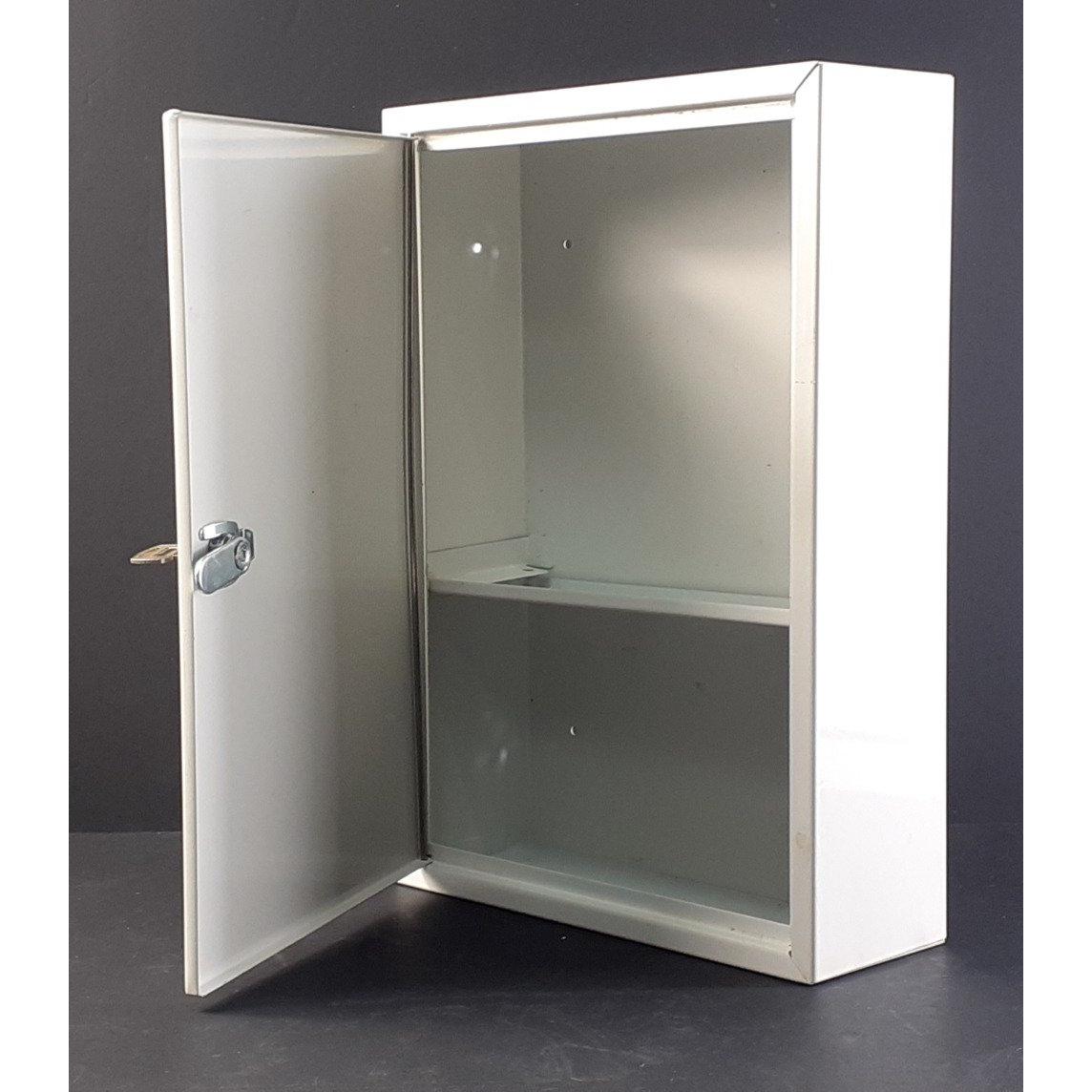 A RED CROSS metal wall box. 32cm x 22cm x 8cm approx In good order with key.