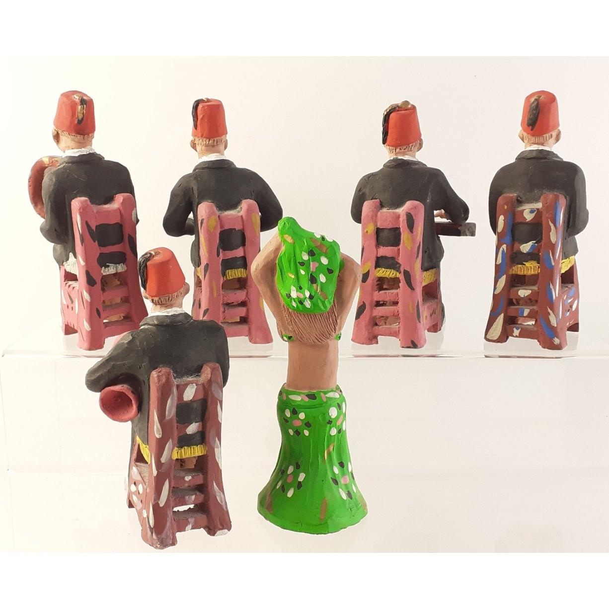 A five piece Egyptian musical group along with a belly dancer, each approx 12cm tall on a black painted stage with back mirror. No damageApprox 6 pieces