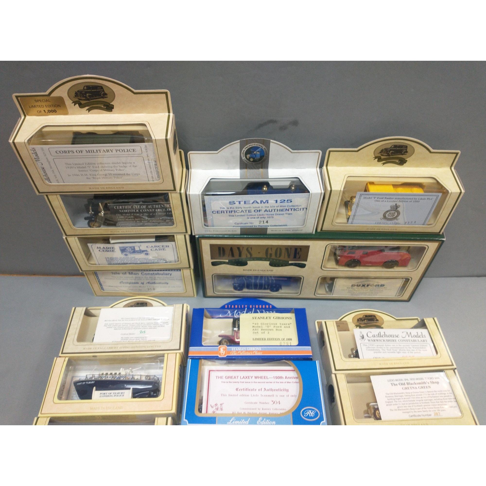 A collection of limited edition model vehicles, mostly with certificates to include Isle of Man Post Office series 3/1990 series 4/1991, LLEDO DG50 Bull nose Morris, Duxford 1994 and 1995, PROMOTORS Port of Tilbury Police,
