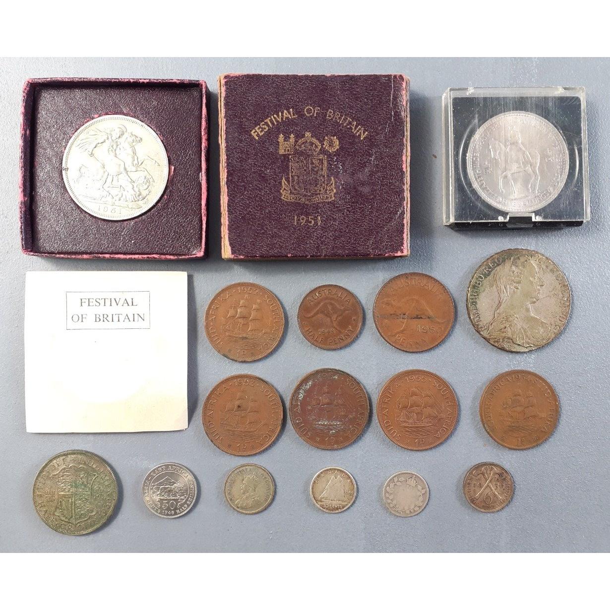 Small collection of coins of interest to include 1951 crown in box, a Marie Theresa Thaler and others.