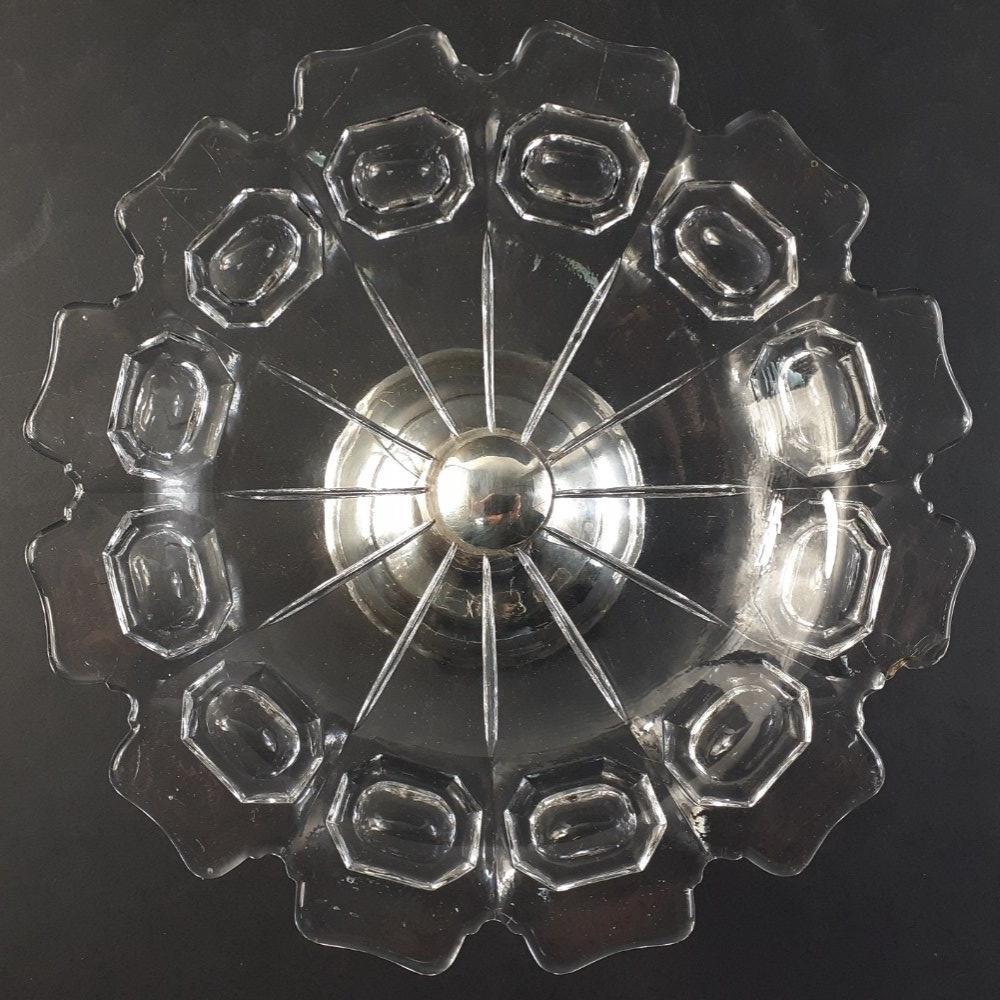 A crystal comport with white metal base and continental Maltese Cross hallmarks. Stands 12cm tall, 21cm across. A very attractive item in good order