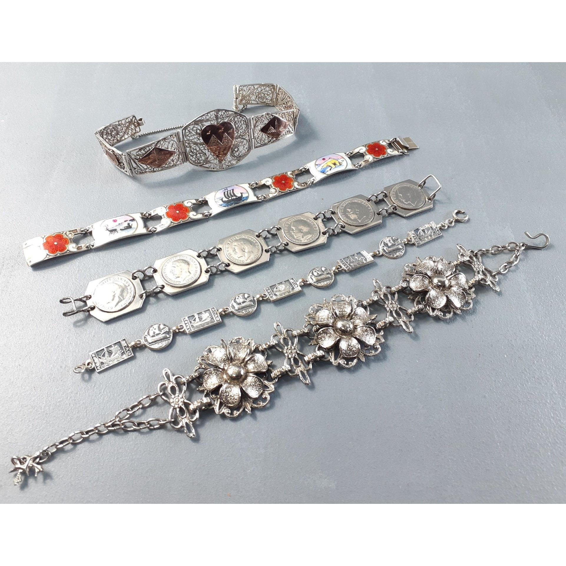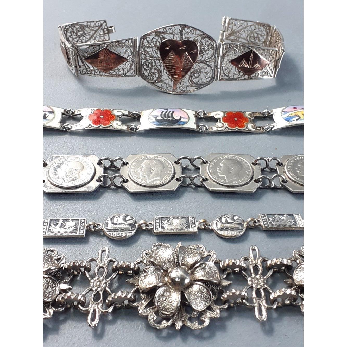 Good quality collection of five stylish bracelets to include Scandinavian themed unmarked bracelet with enamel panels, a pierced worked bracelet with yellow metal applied panels and one other of floral design.