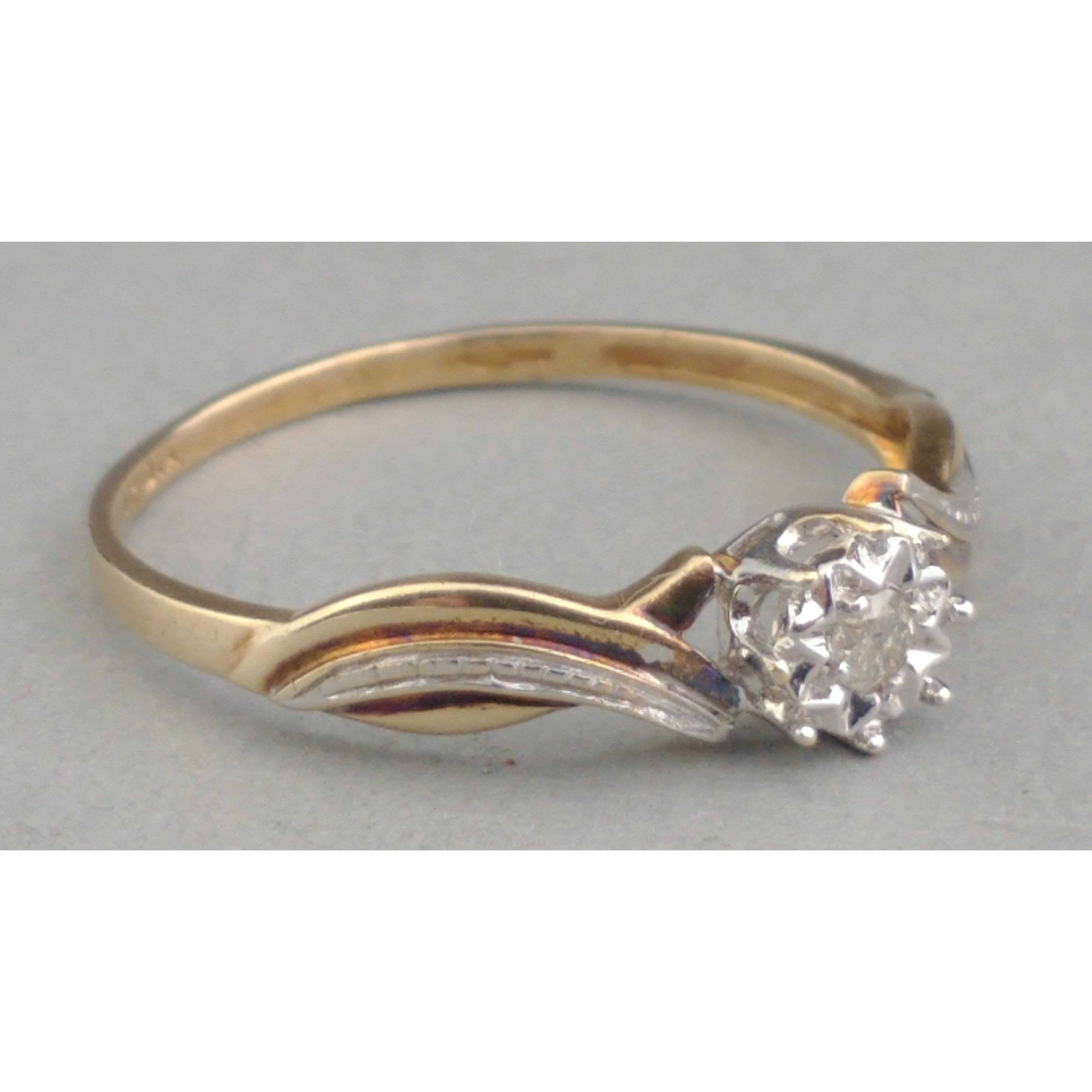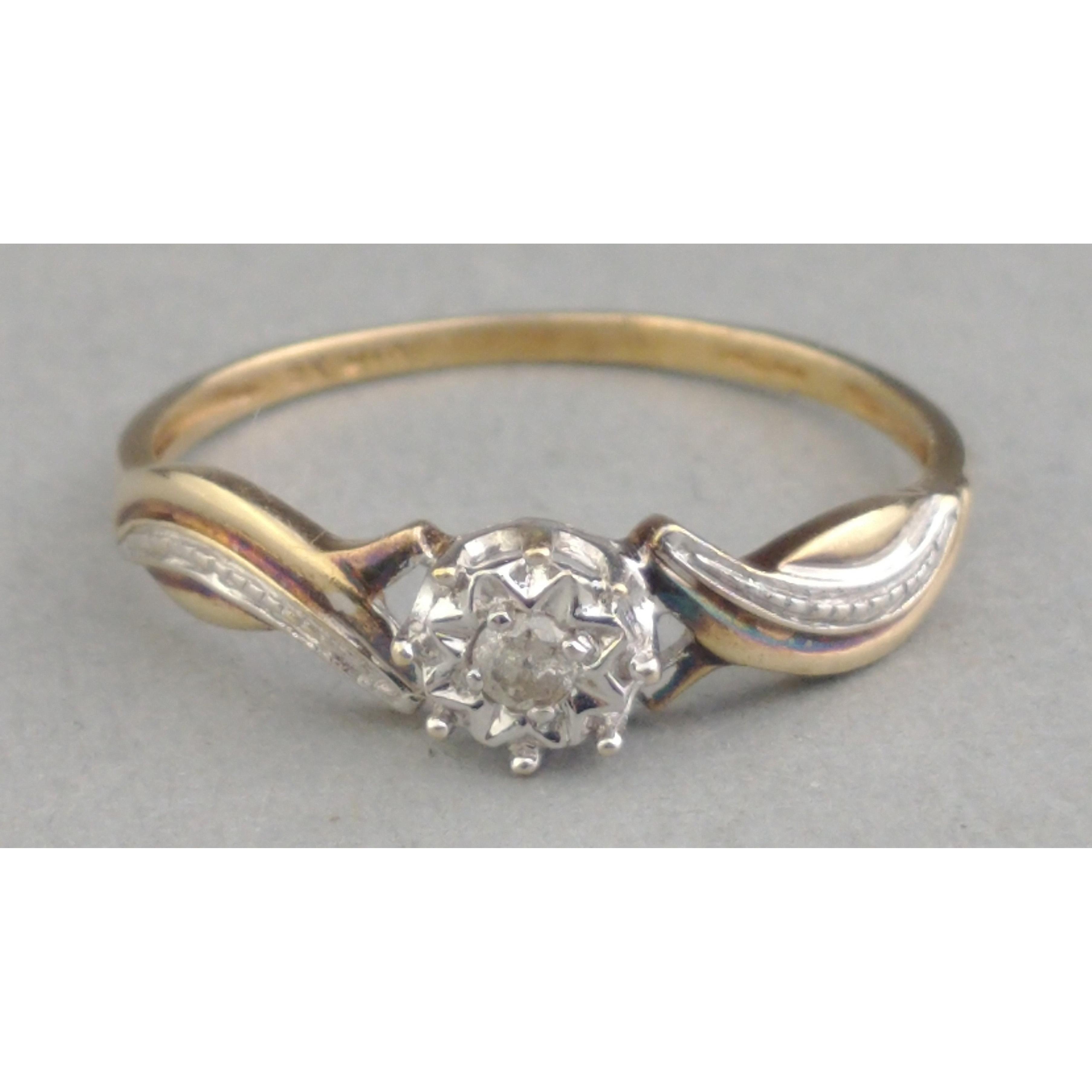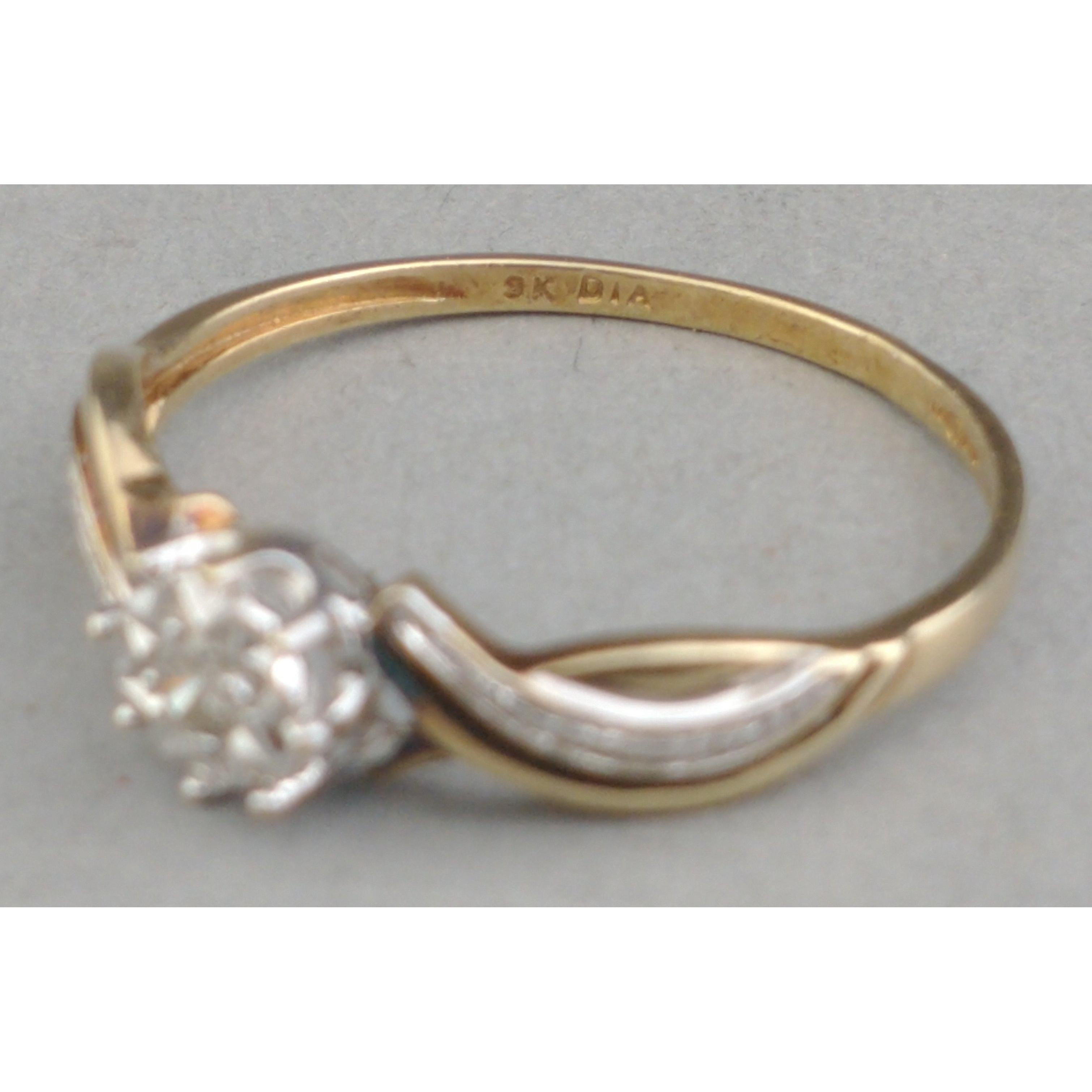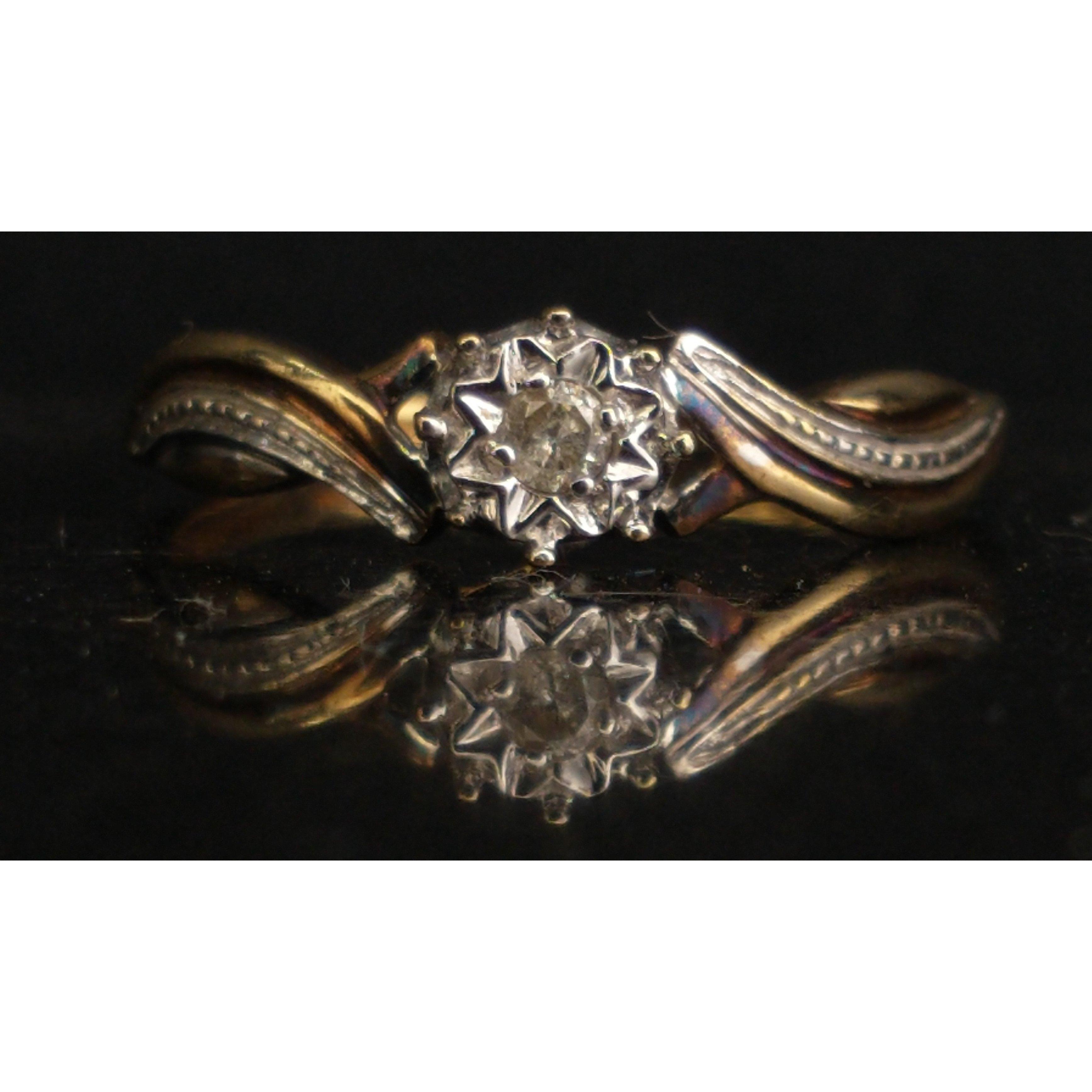 A 9K stamped ring with illusion set diamond (tested) centre stone. Size Q , gross weight 1.35g approx.