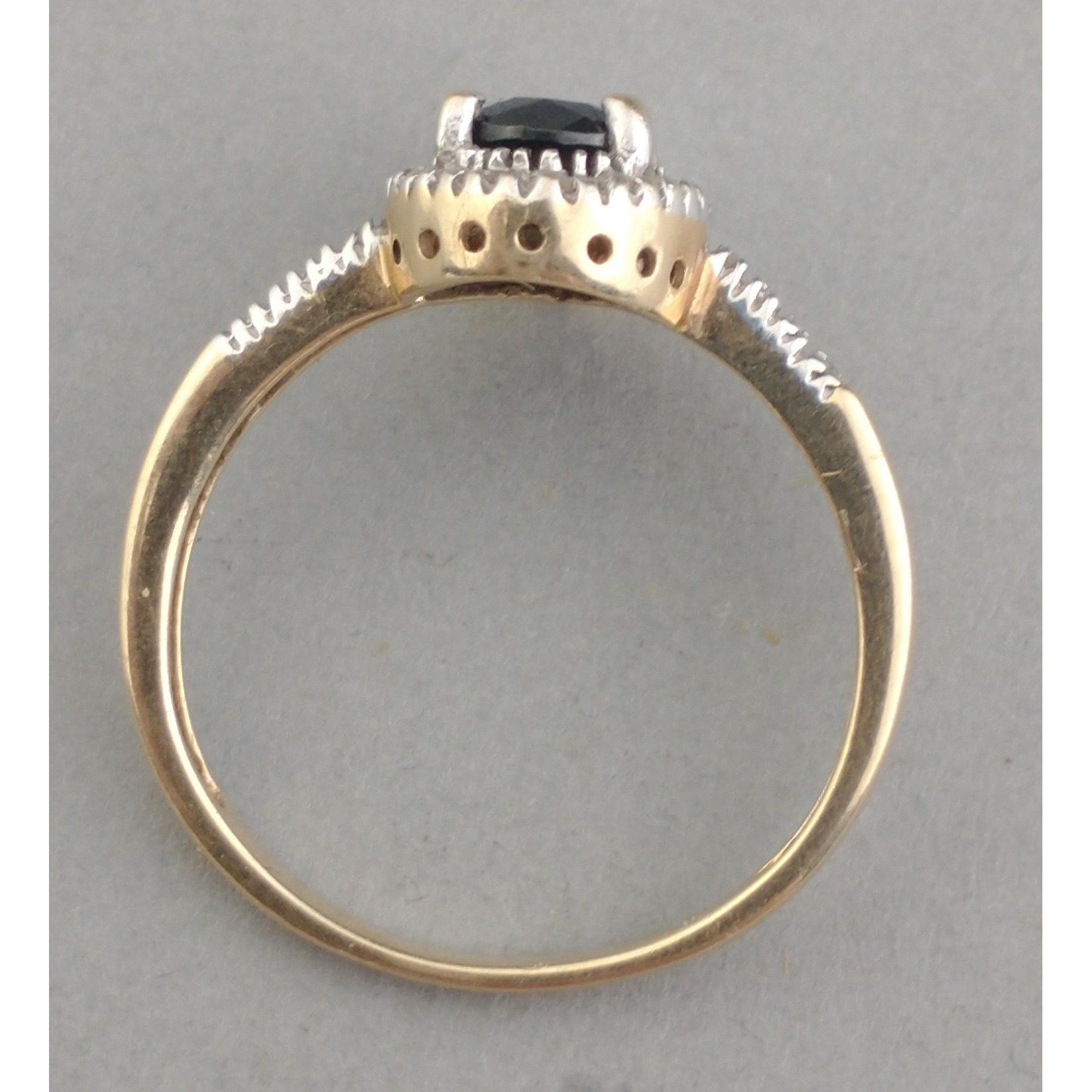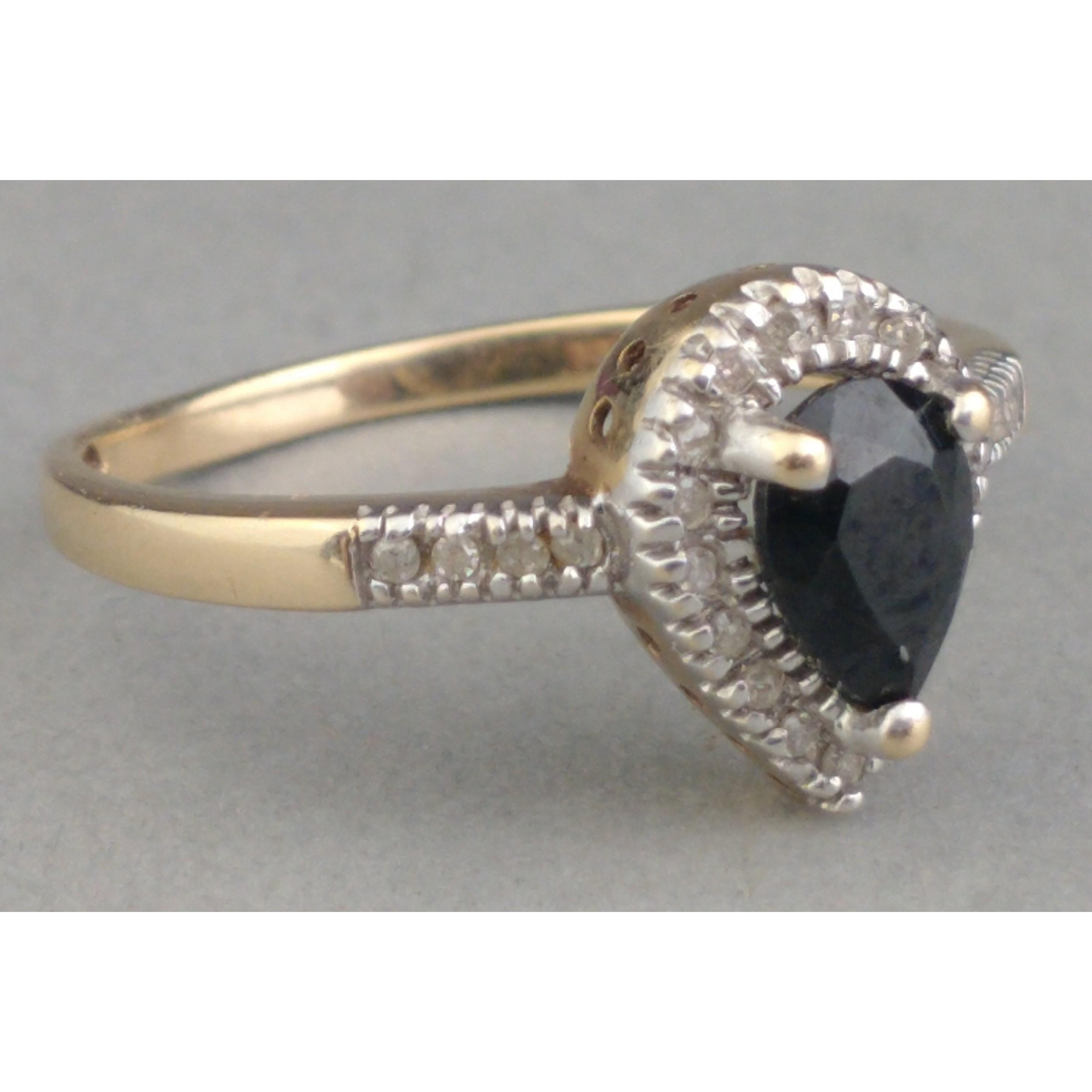 A 375 stamped (indistinct) ring, Size P, gross weight 2.15g approx. With pear shape central stone and diamond chips. An attractive ring in nice clean condition.