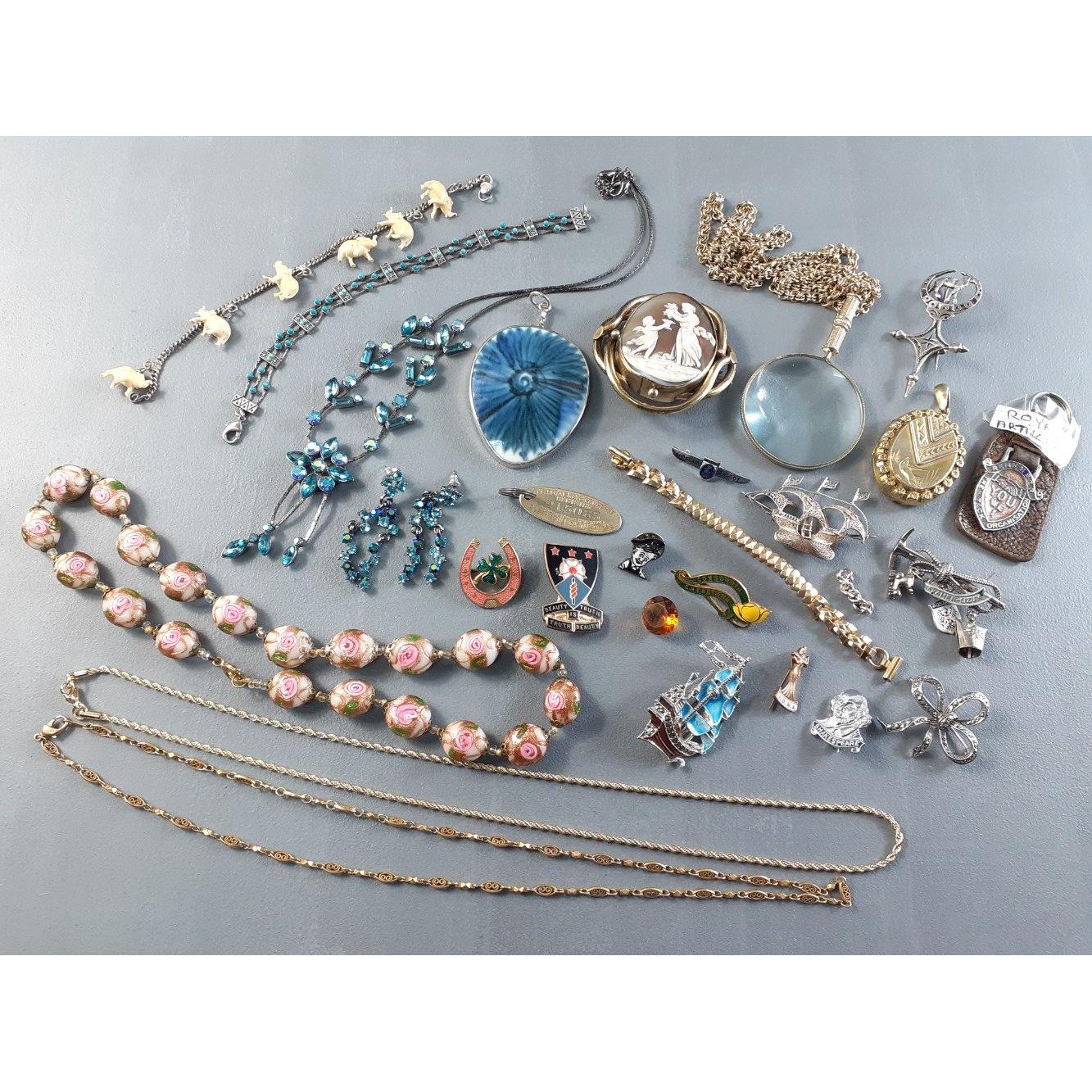 An interesting lot of jewellery, buttons, badges, beads etc to include pinchbeck brooch, spoons with nips, interesting brooch in the shape of a ship, gilt chains, and much more.