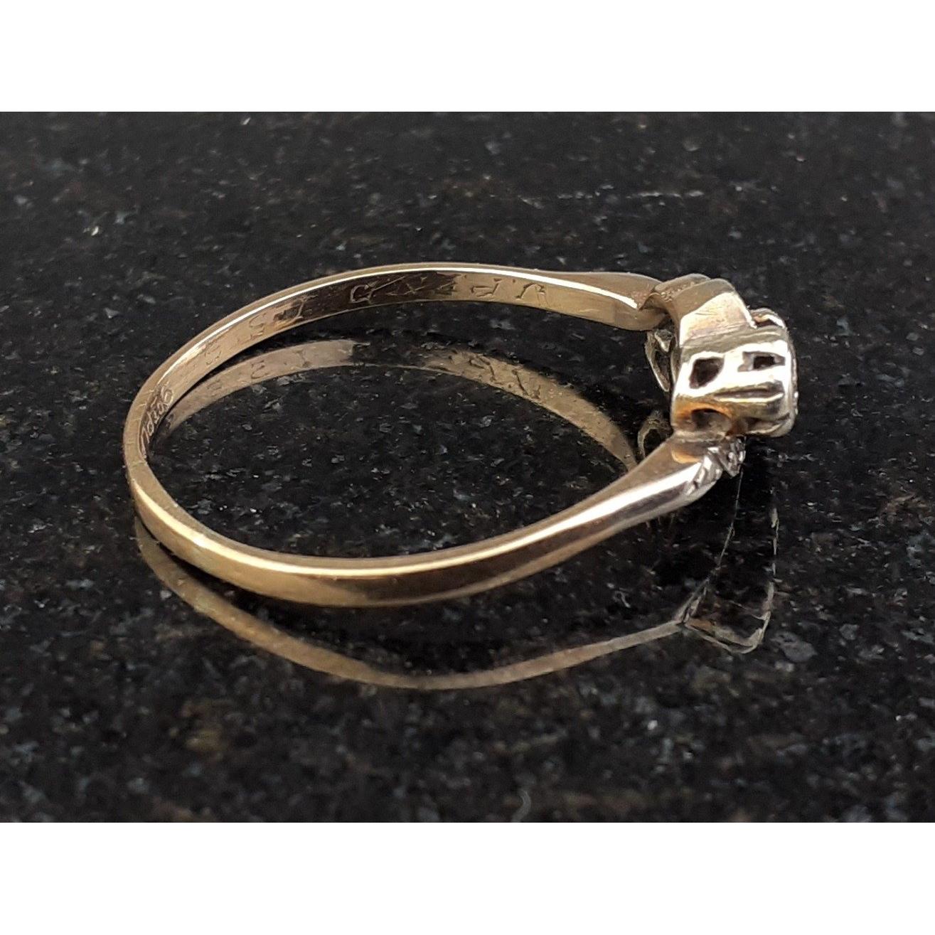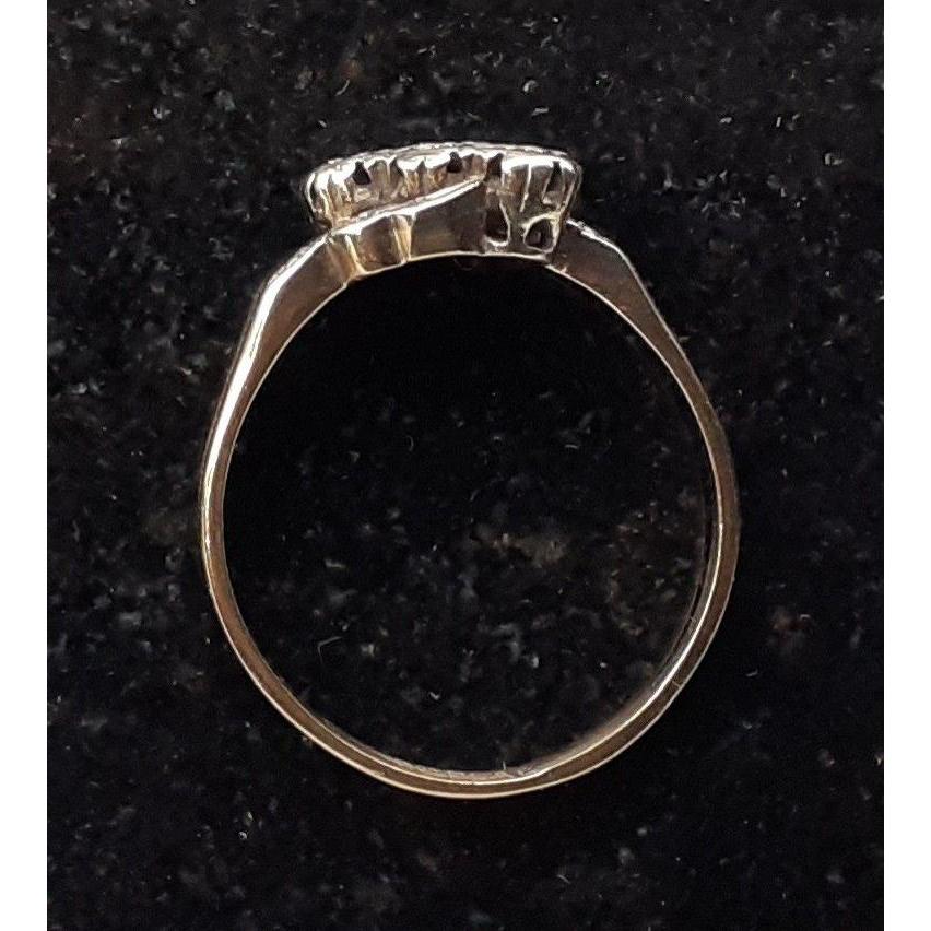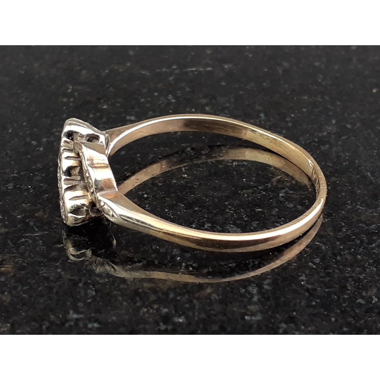 A ring marked 9ct Plat. Size T, 2.3g approx. Three 1mm diamonds (tested).