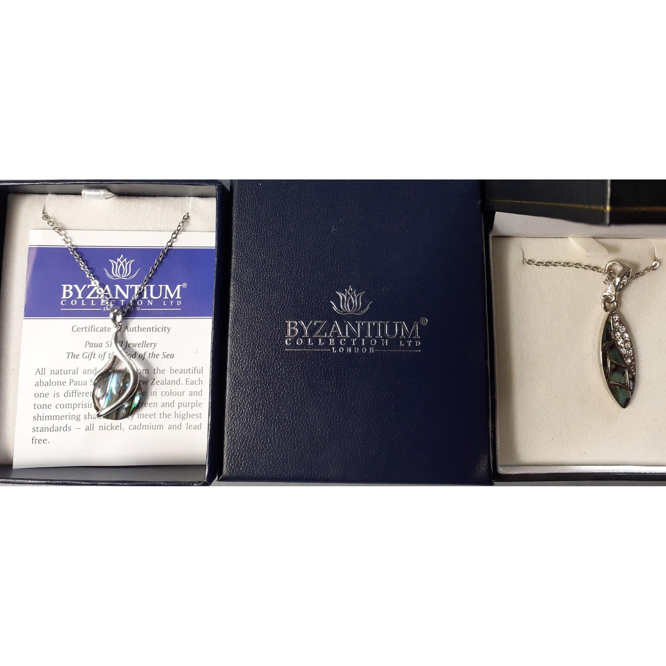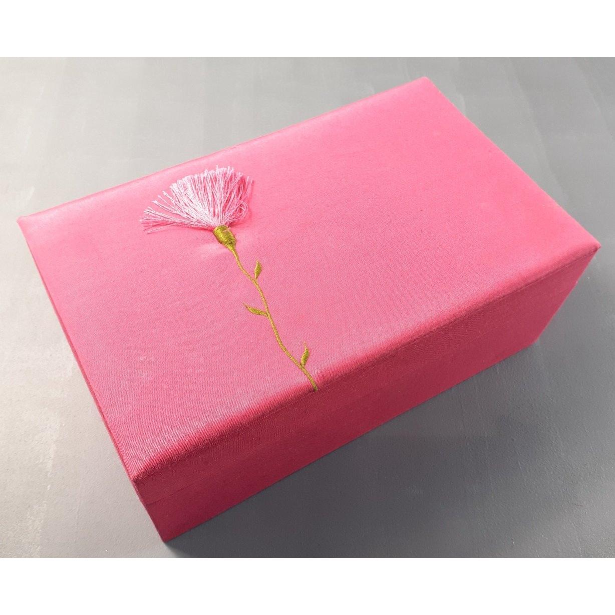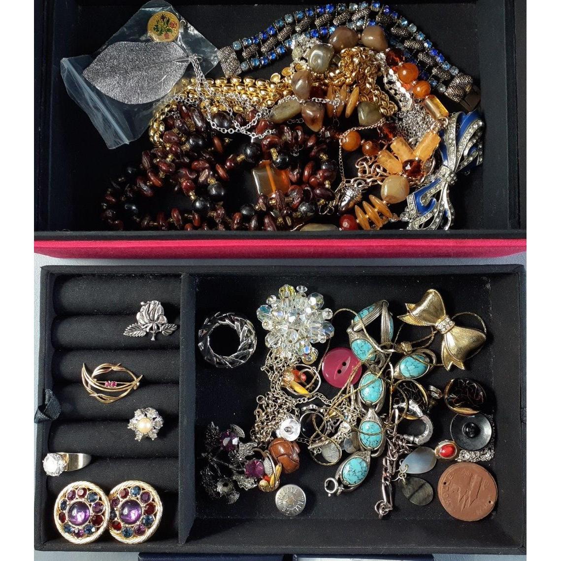 A fuchsia pink jewellery box (25 x15 x 9cm approx) with lift out top tier with contents of costume jewellery to include 2 boxed BYZANTIUM pendants and necklacesApprox 1 pieces