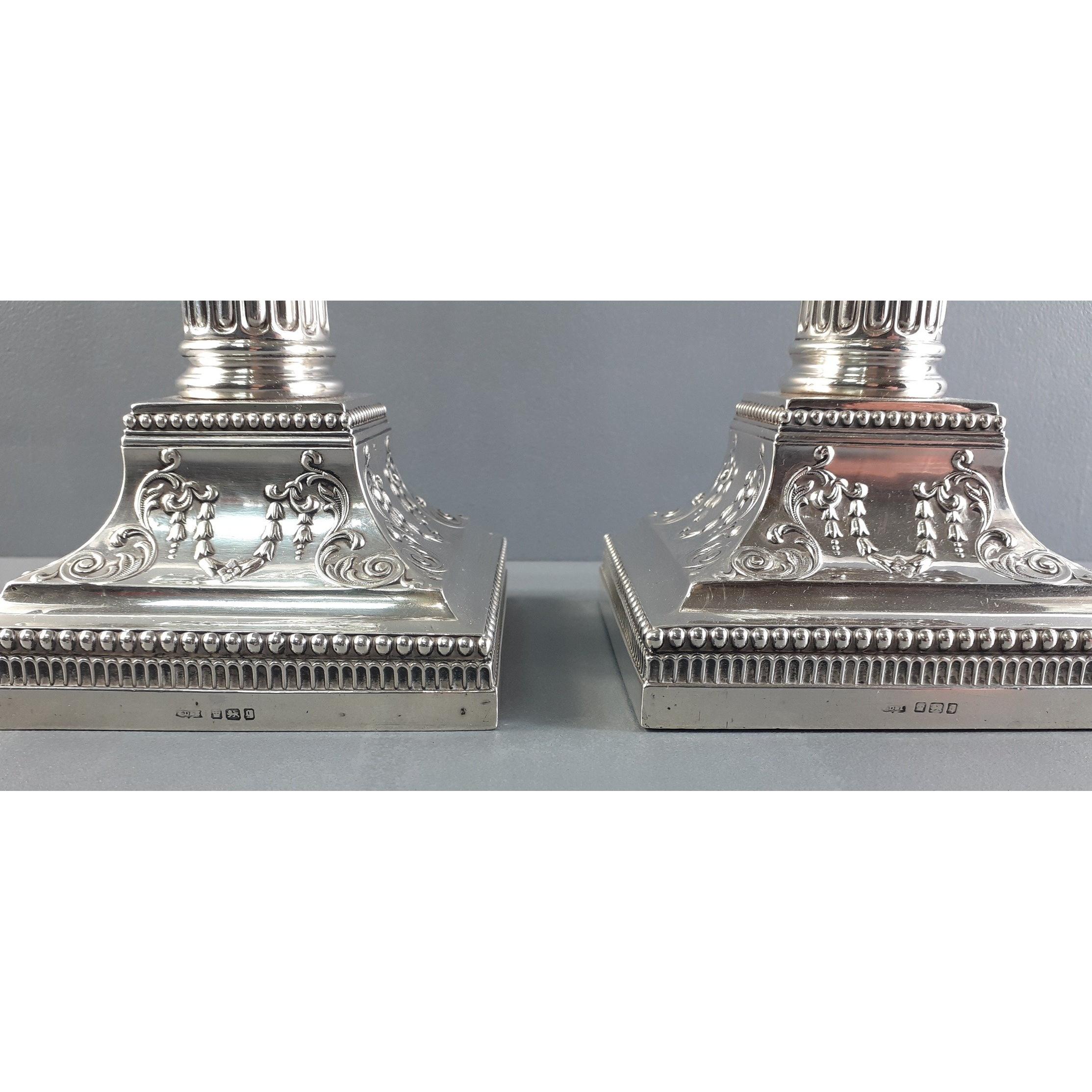 A stunning pair of sterling silver fully hallmarked Corinthian candlesticks by James Dixon & Sons Sheffield complete with original sconces. Some light rubbing to hallmarks and very minor indents to the bases. Each stands 22cm approx and weighs 715g approx, 1430g gross, bases weighted.