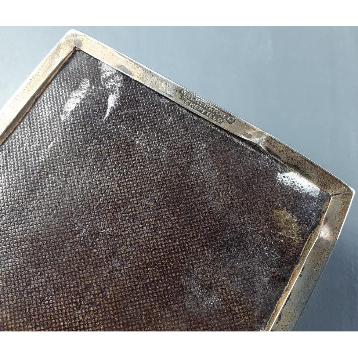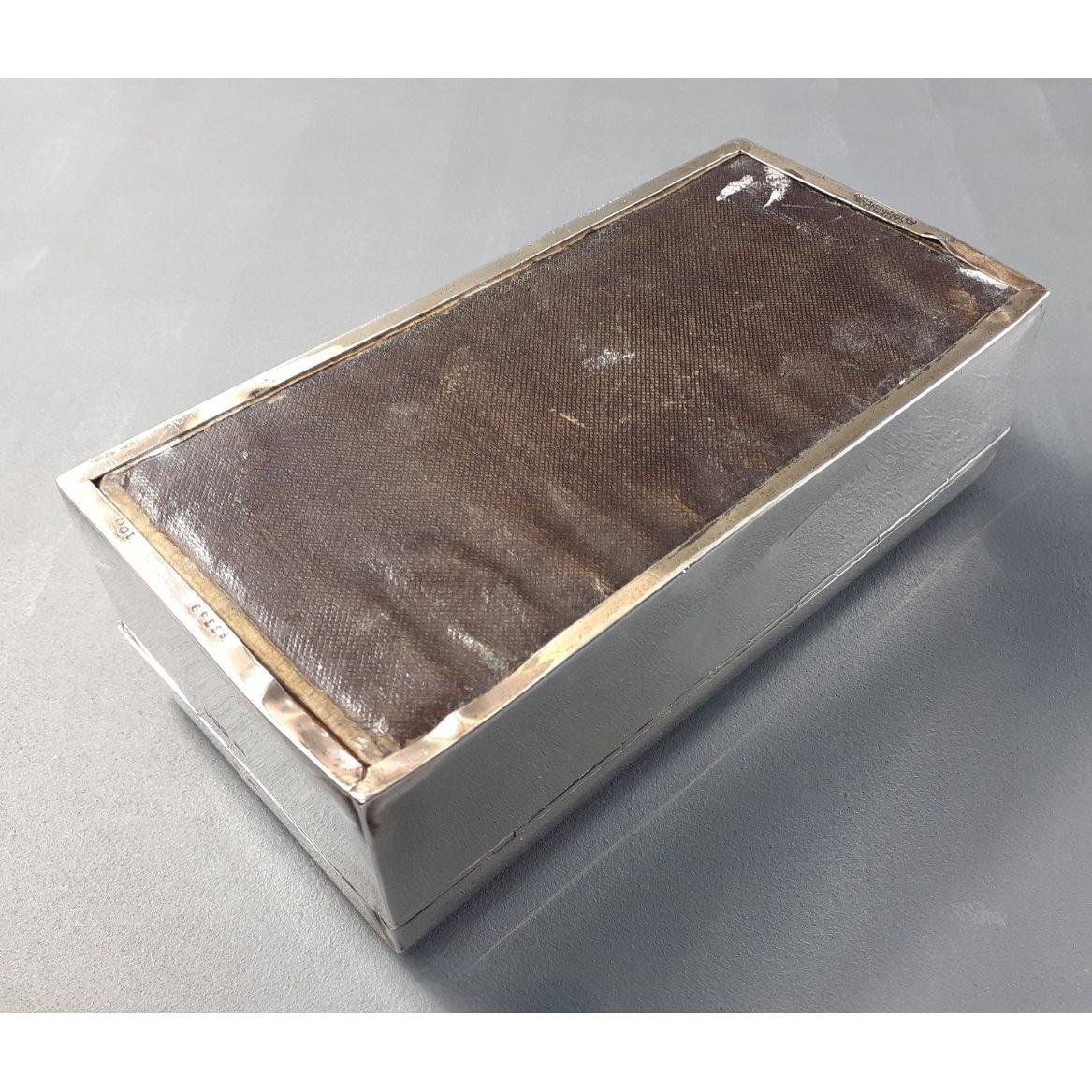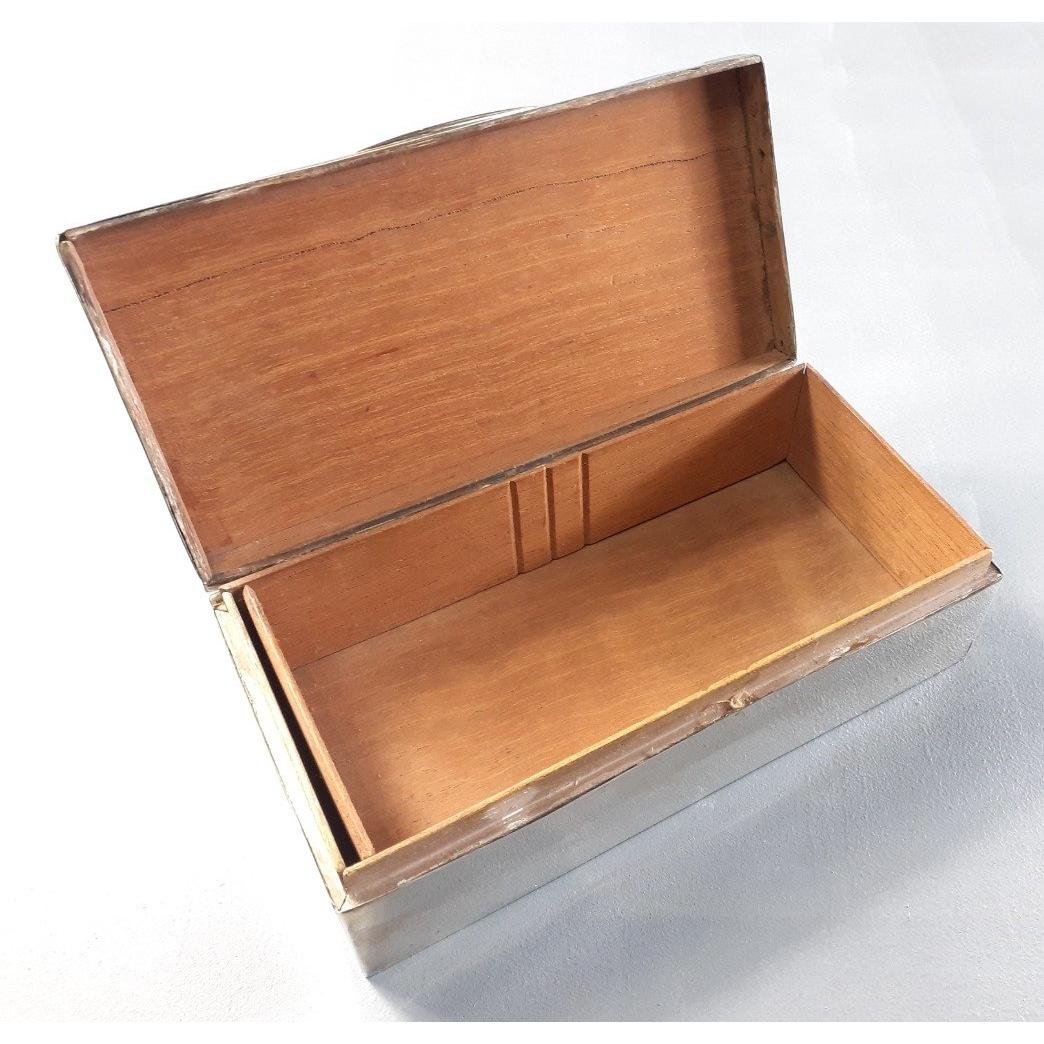 A lovely sterling silver cedar lined cigarette box with sunburst design to lid. Hallmarked Sheffield 1920, maker's name Walker & Hall. Size 18cm x 9cm x 5cm. Gross weight 540g approx. Some dents.