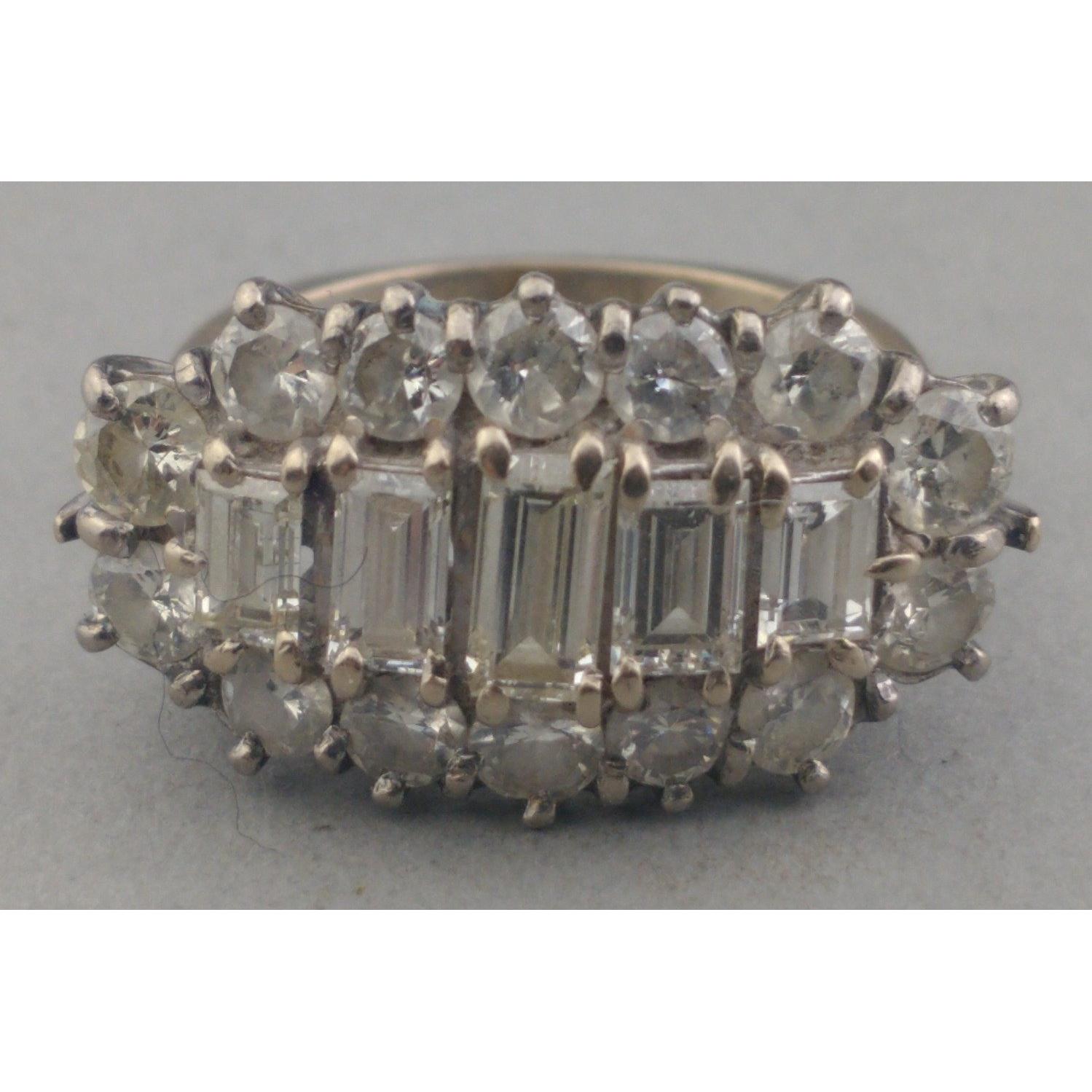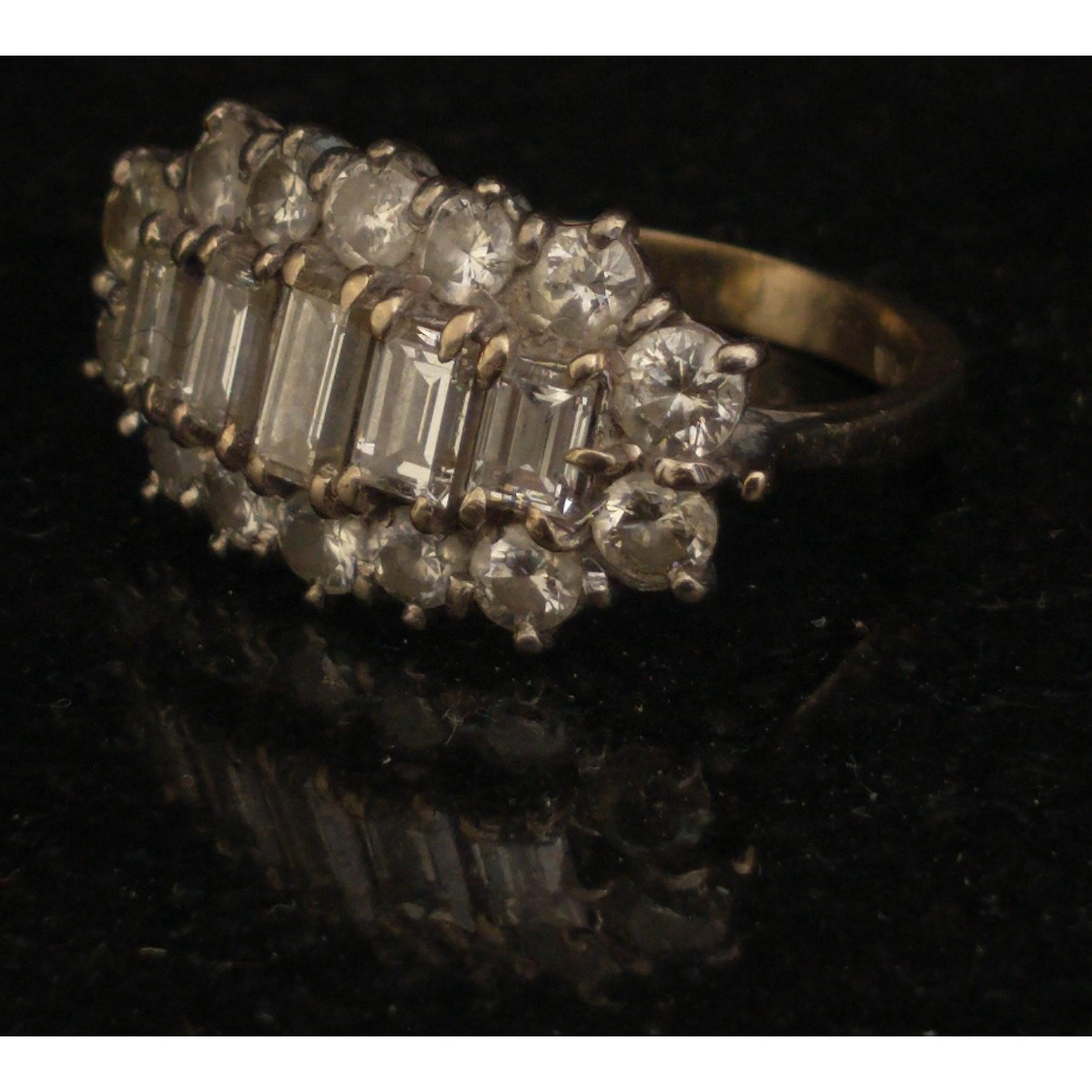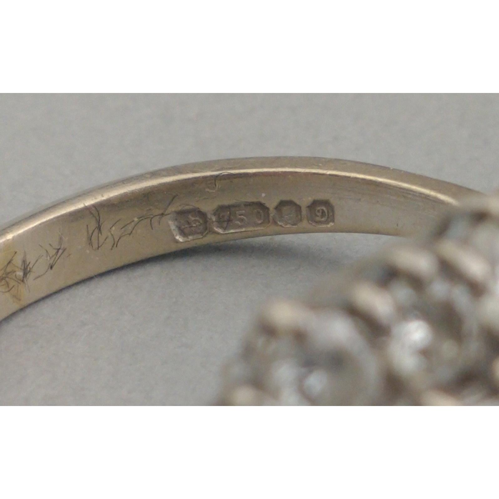 A 750 fully hallmarked FIVE BAGUETTE-CUT central set DIAMOND ring with 14 surrounding round-cut brilliant diamonds - a truly STUNNING ring! - large centre baguette-cut diamond with graduated stones flanking either side - ring size L - large diamond 6mm height x 3mm width approx - small round cut diamonds 3mm diameter each approx - gross weight 6.46g approx