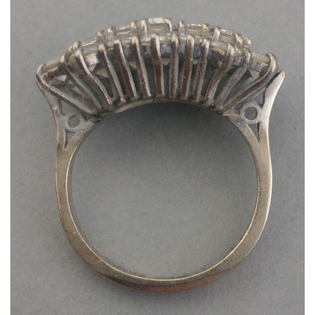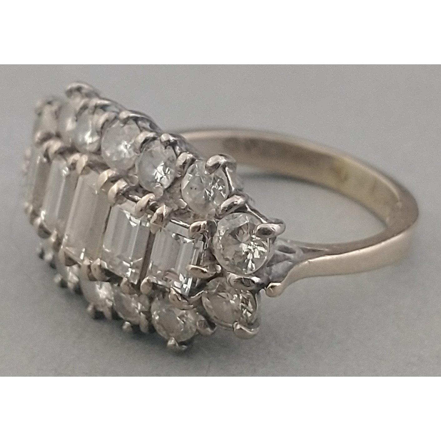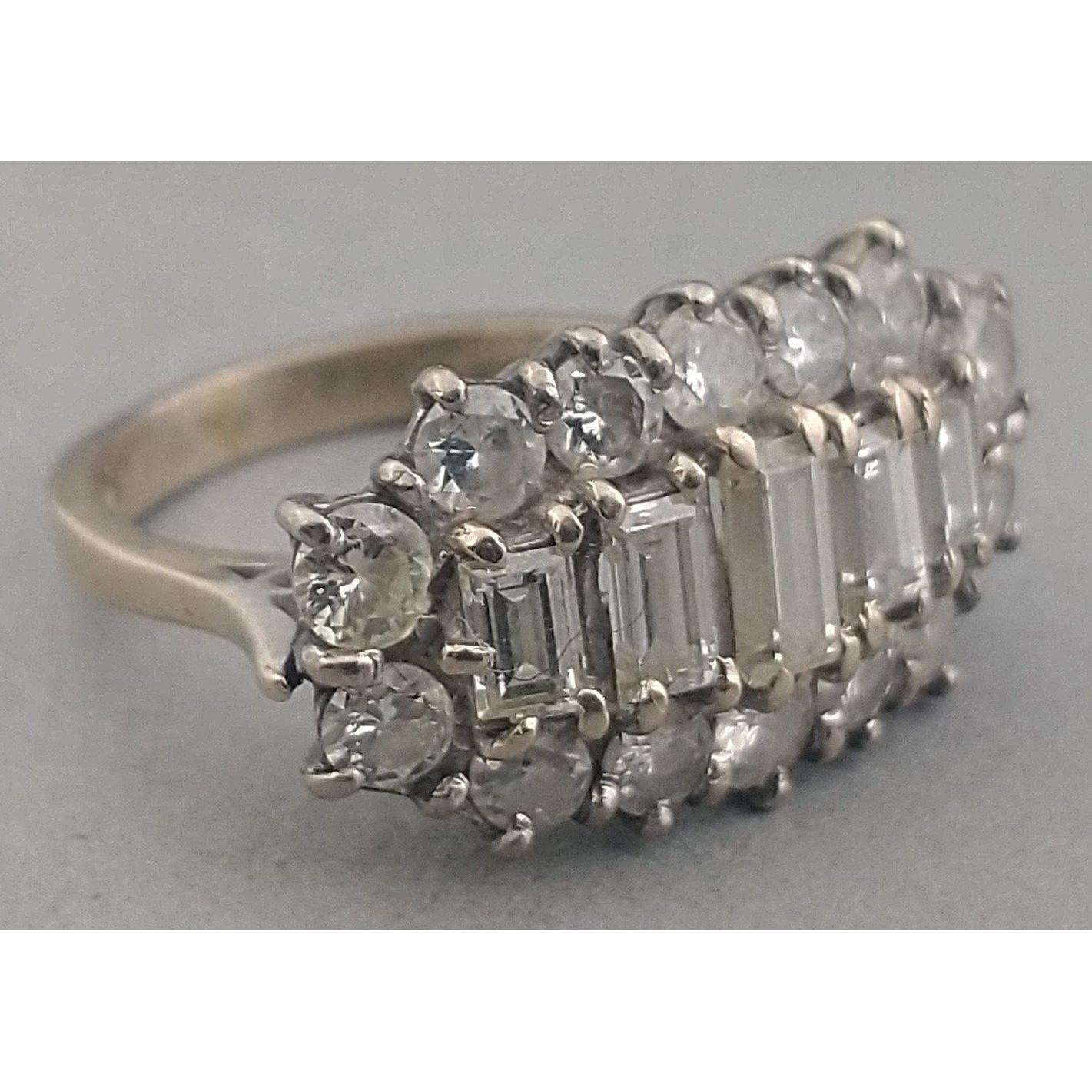 A 750 fully hallmarked FIVE BAGUETTE-CUT central set DIAMOND ring with 14 surrounding round-cut brilliant diamonds - a truly STUNNING ring! - large centre baguette-cut diamond with graduated stones flanking either side - ring size L - large diamond 6mm height x 3mm width approx - small round cut diamonds 3mm diameter each approx - gross weight 6.46g approx