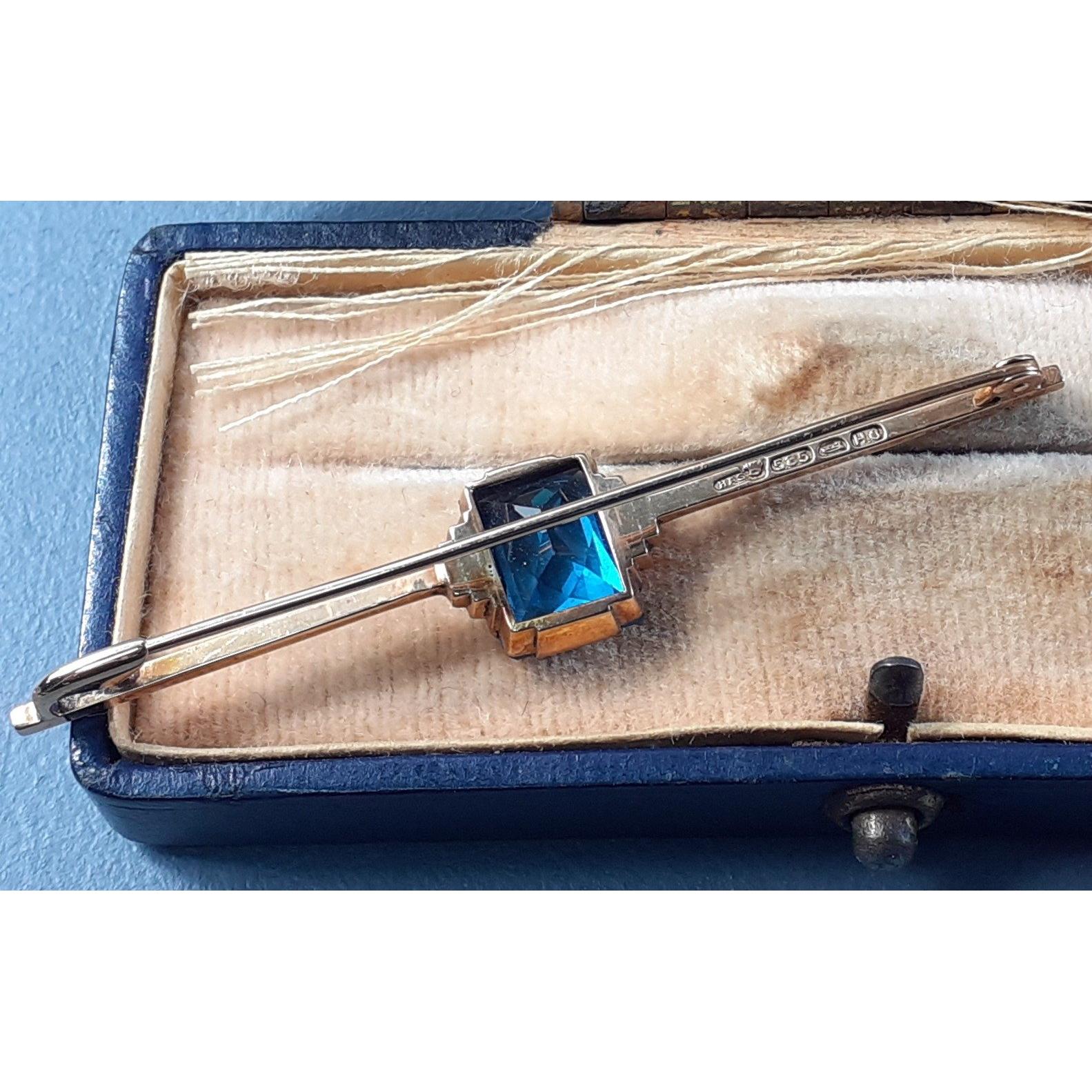 A gorgeous 585 stamped bar brooch with impressive faceted central blue stone. 6cm approx and presented in an older jeweller's box. Gross weight 3.9g approx
