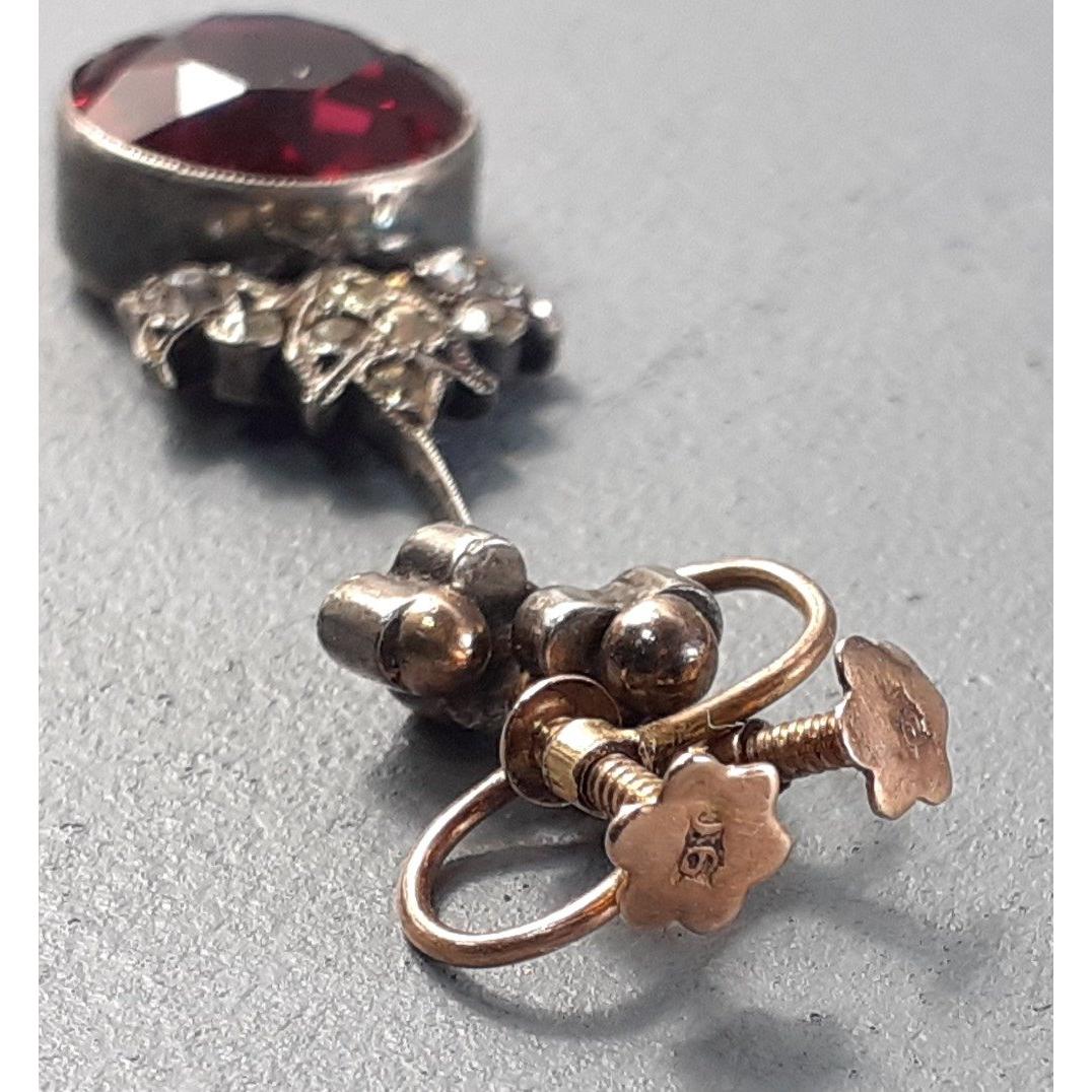 A 9ct stamped to stem pair of earrings with large red stones. Tops only appears 9ct. One backing broken. Total gross weight 8.65g approx