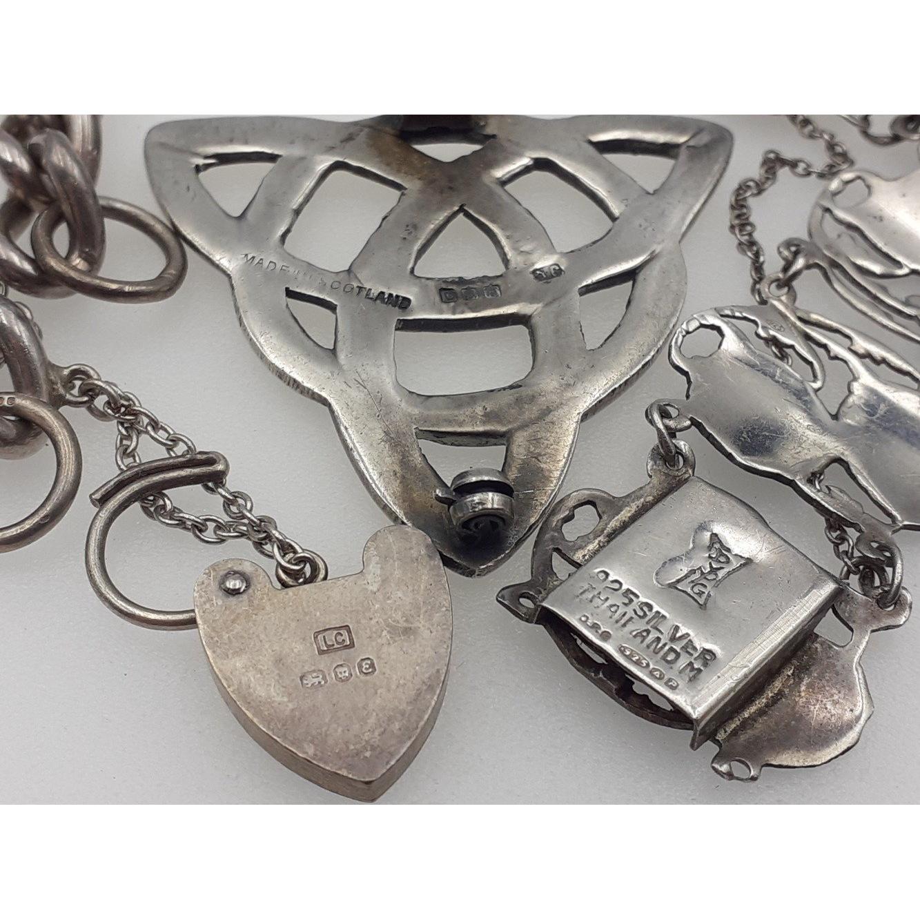 A silver collection of jewellery to include a Celtic knot brooch with Edinburgh hallmarks, Thai silver bracelet and a silver bracelet with lock. Total gross weight 67.5g approx.