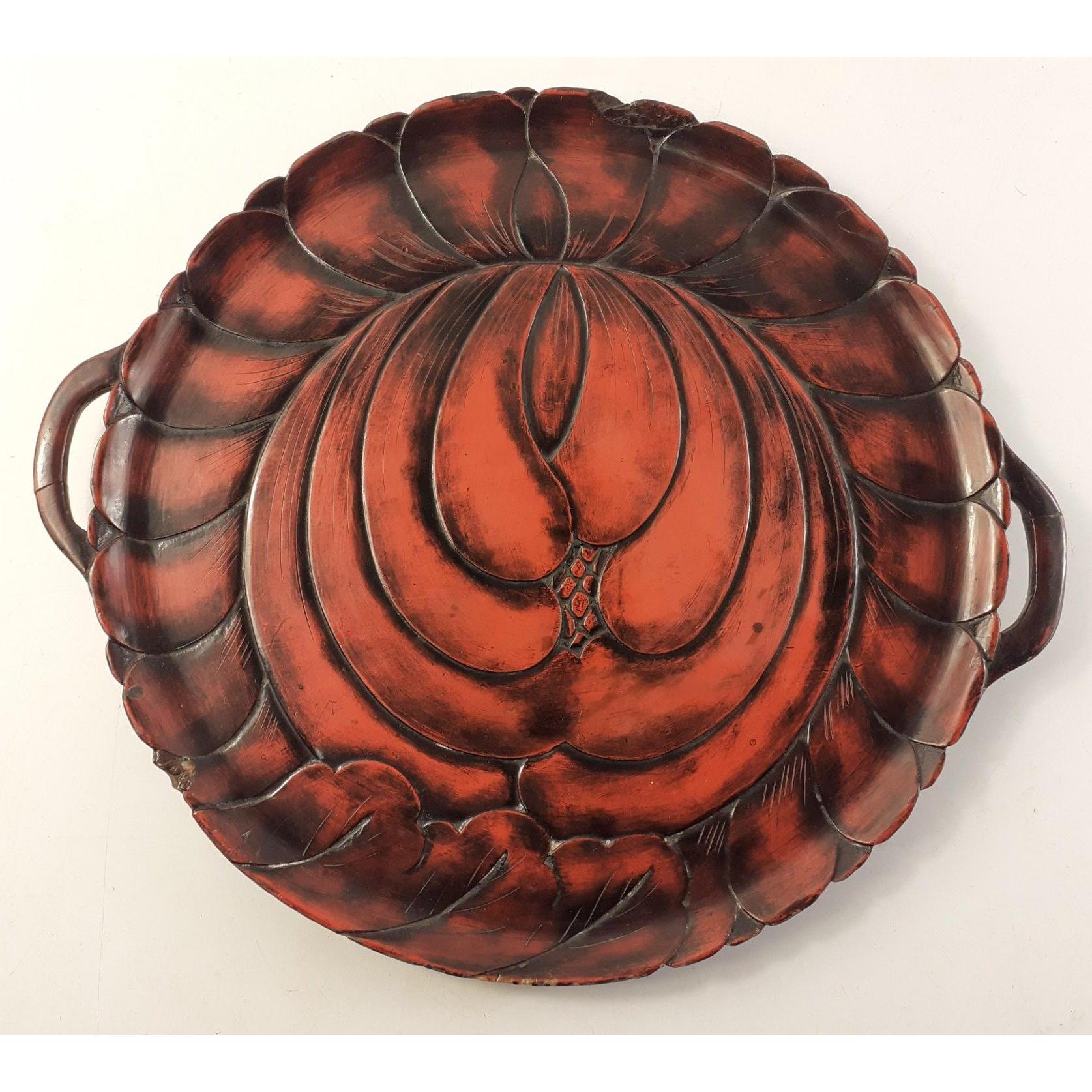 A lovely Arts and Crafts style wooden handled tray 41cm. in lovely useable condition. Note minor age related edge chips.