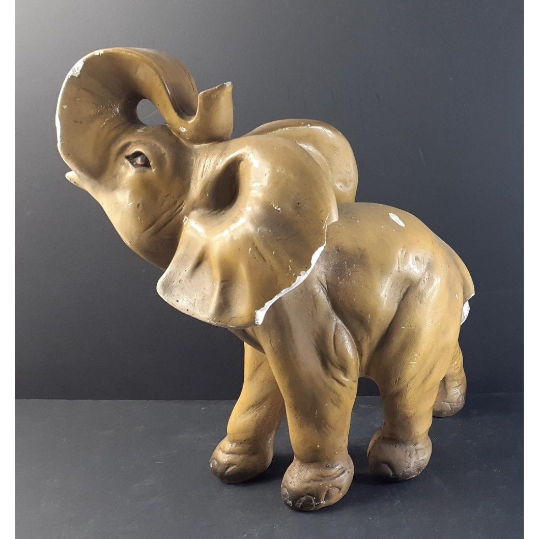 A wonderful vintage plaster model of an elephant with trunk raised. Some damage noted to tusks, ears etc. but still a wonderful piece. Stands 36cm tall approx.