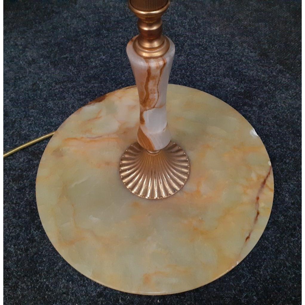 An onyx and brass effect standard lamp with shade in good useable condition. Stands 166cm approx.
