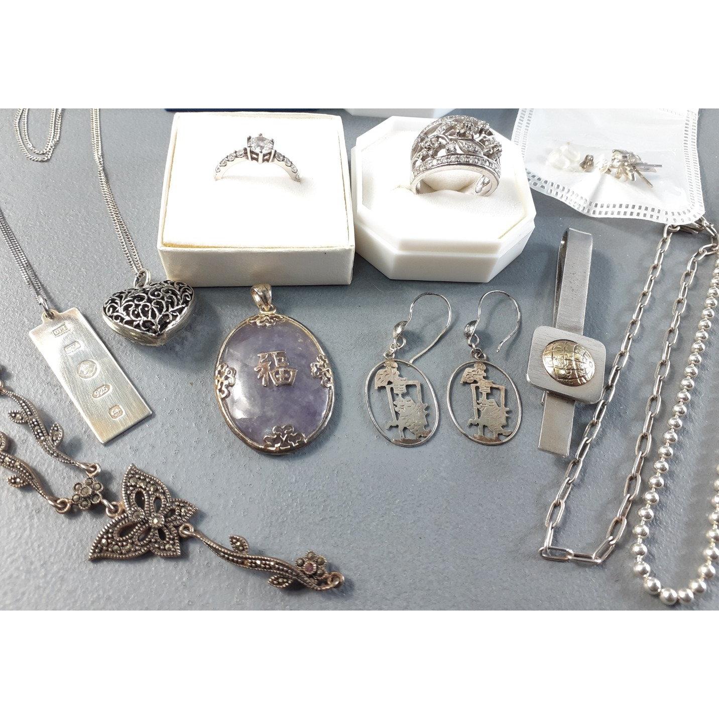 A collection of silver jewellery to include an ingot on a chain, 925 stamped note clip, marcasite necklace, 2 rings size N, chains etc