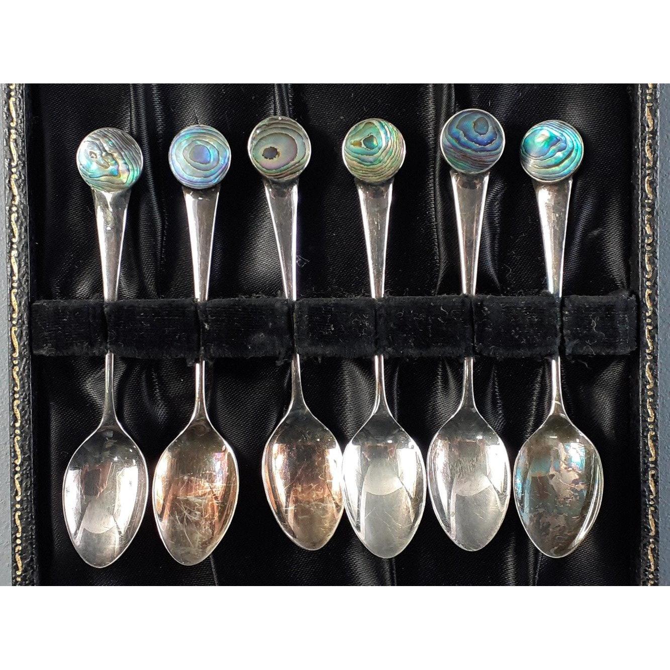 NICE QUALITY! A nice set of six white metal ABALONE handled teaspoons within their original Wellington presentation case