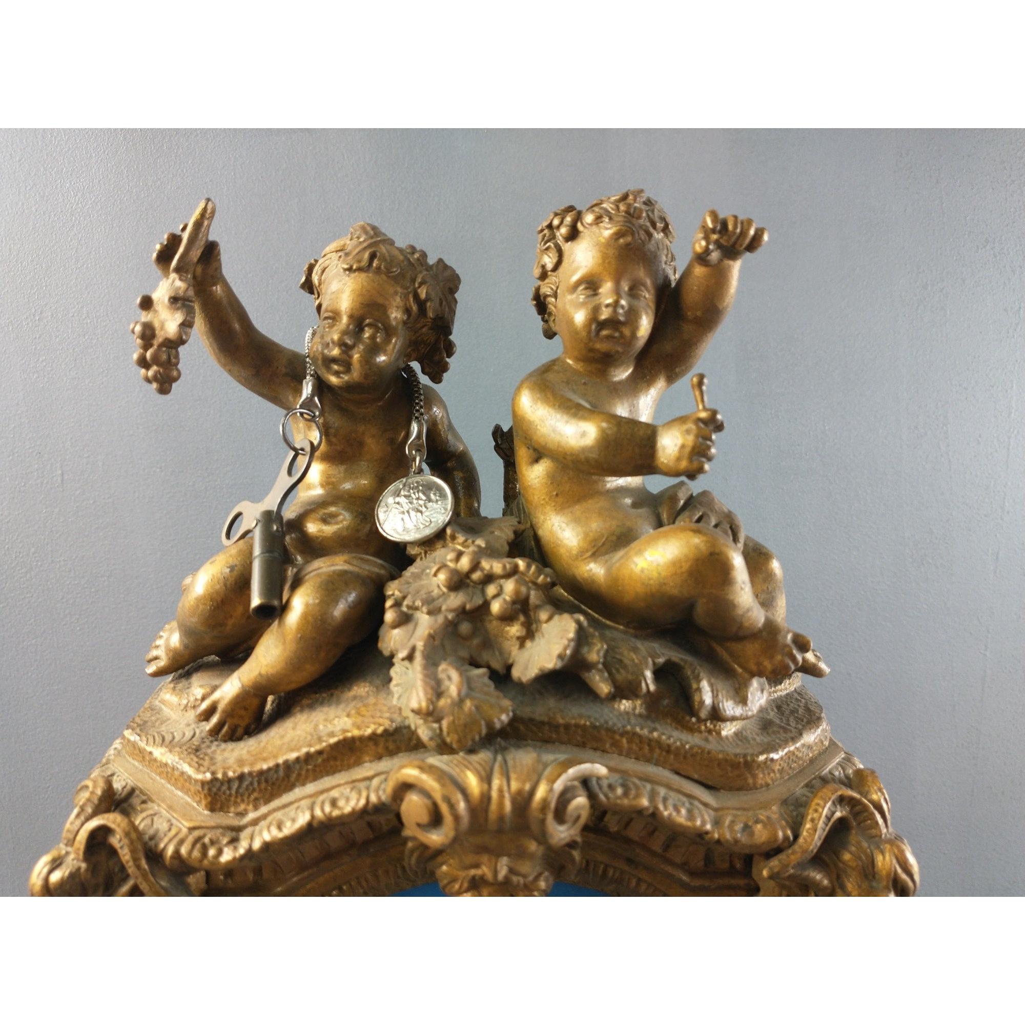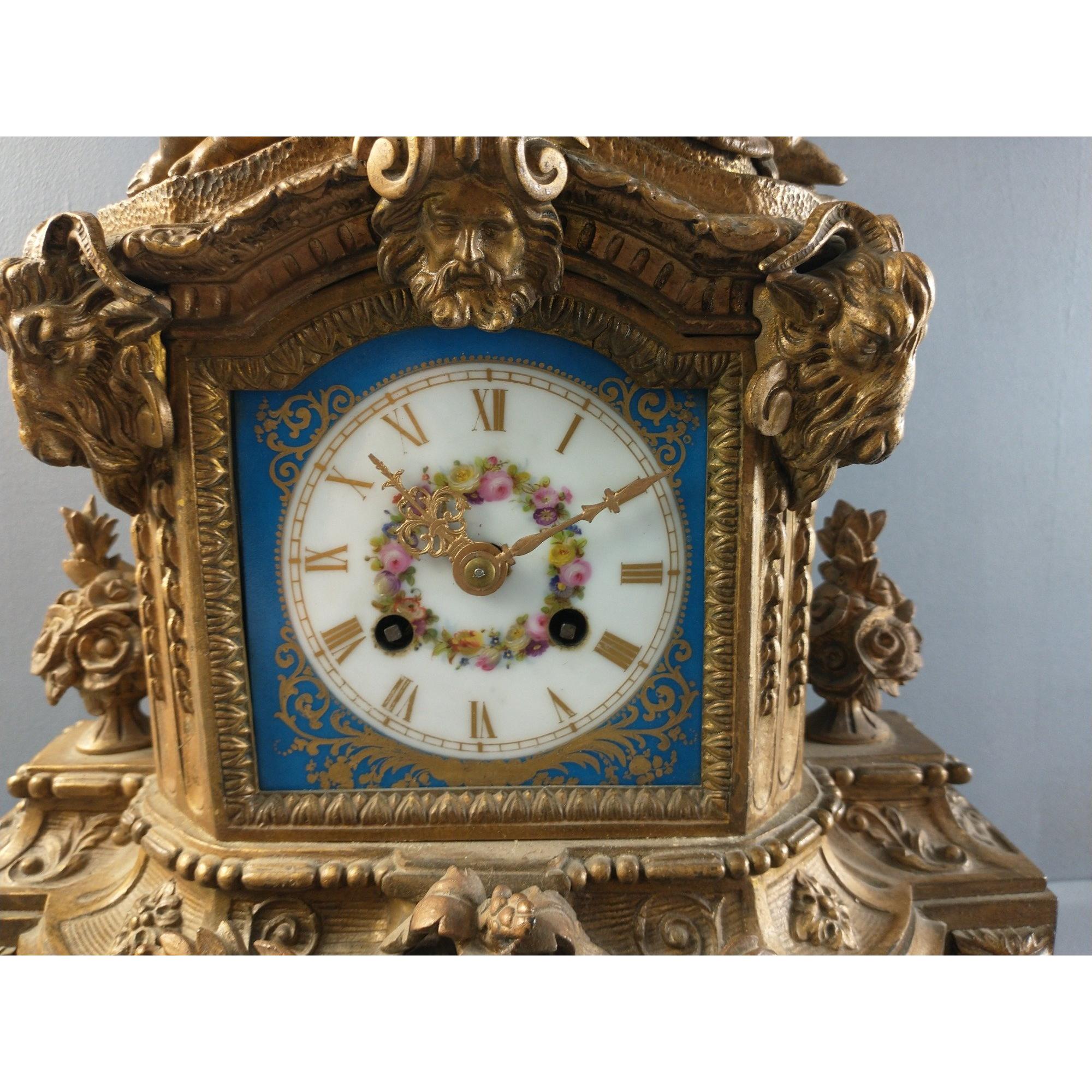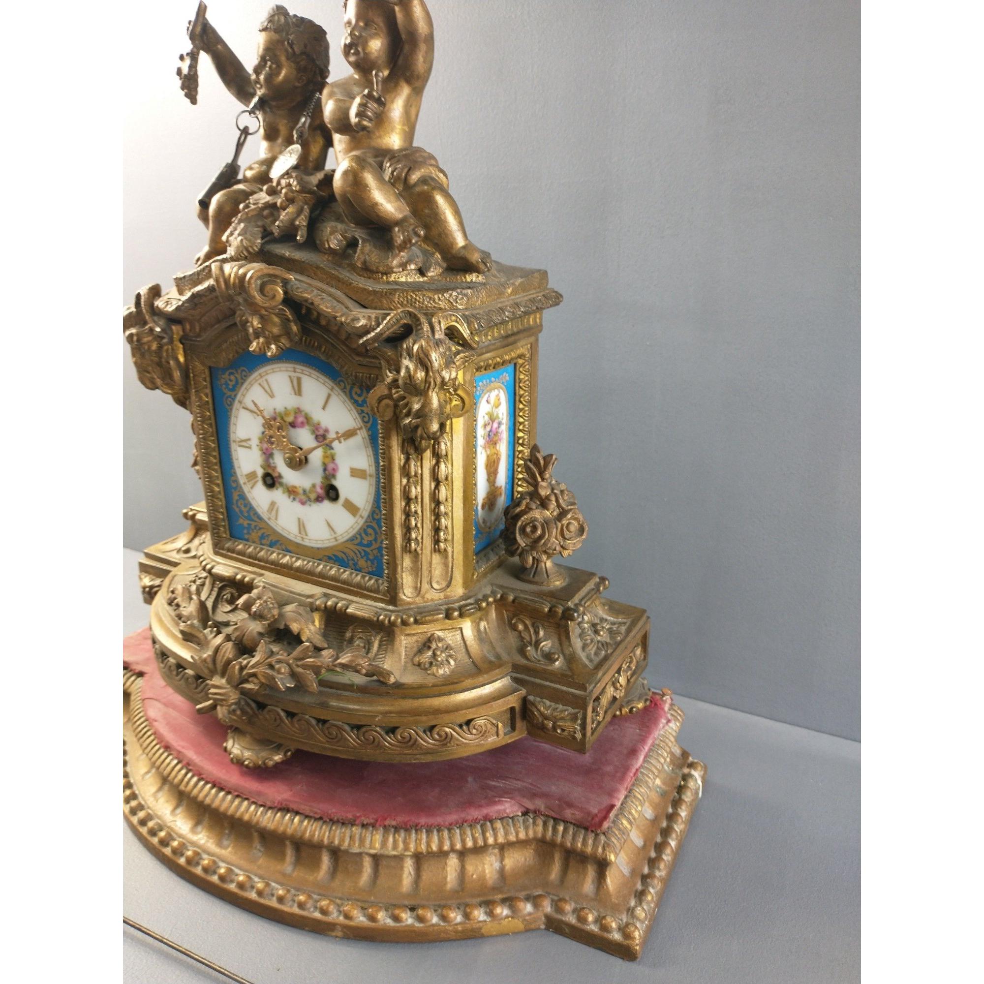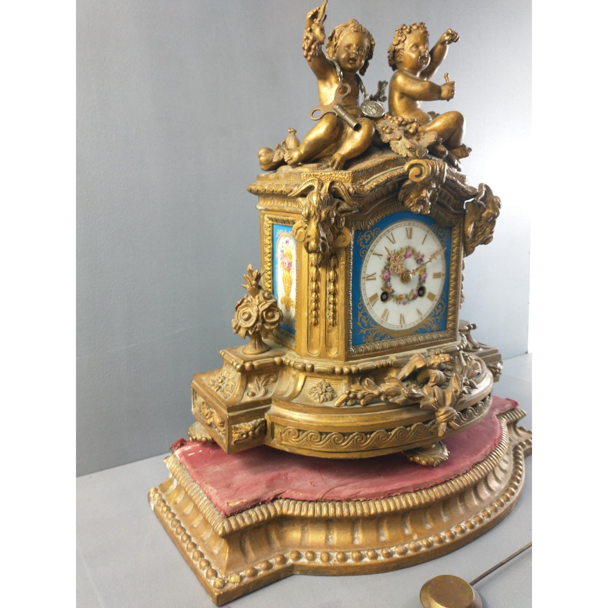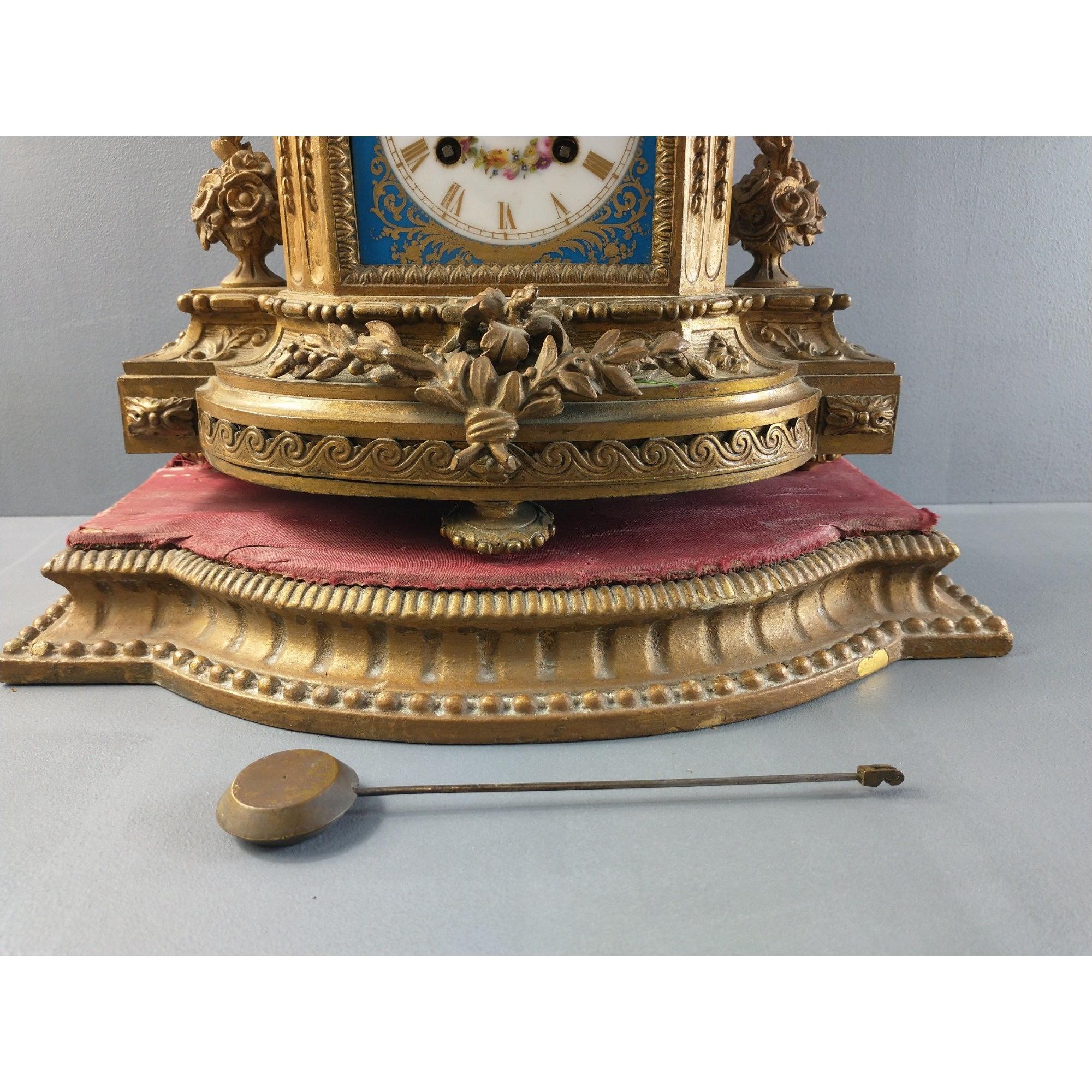 A FRENCH ORMULU mantle clock circa 1880 with Sevres style porcelain panels - movement by Oppenheim, Paris - the clock looks intact with back glass plate intact and comes with pendulum and key and plinth - dimensions from base height 40cm x 30cm width x depth 20cm approx - untested mechanism