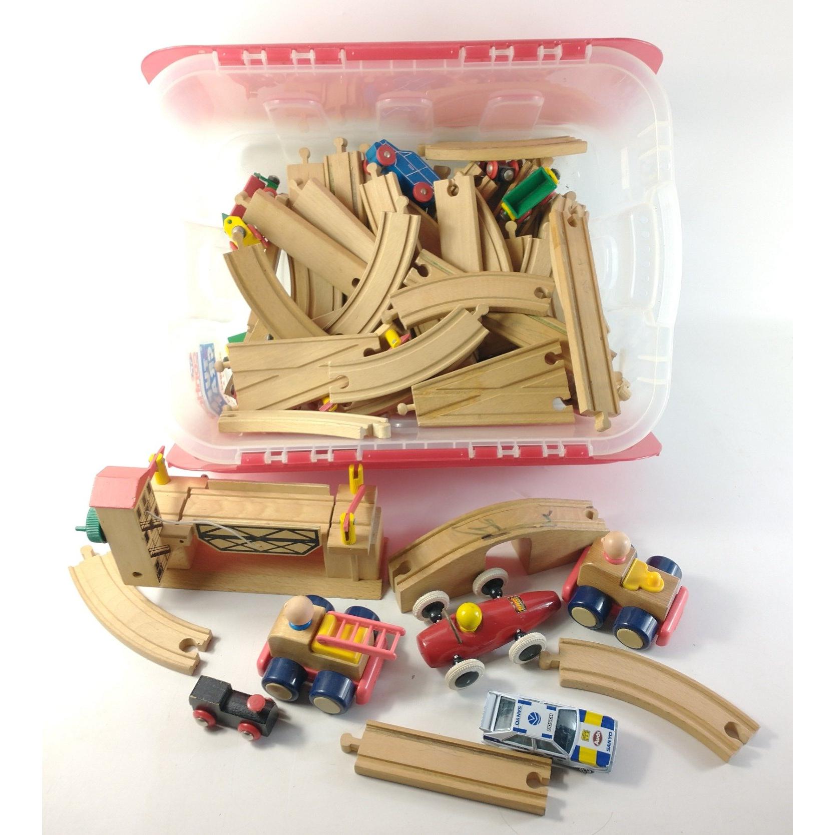 A collection of wooden SWEDISH BRIO drawbridge, sports car, track, a wee train set etc
