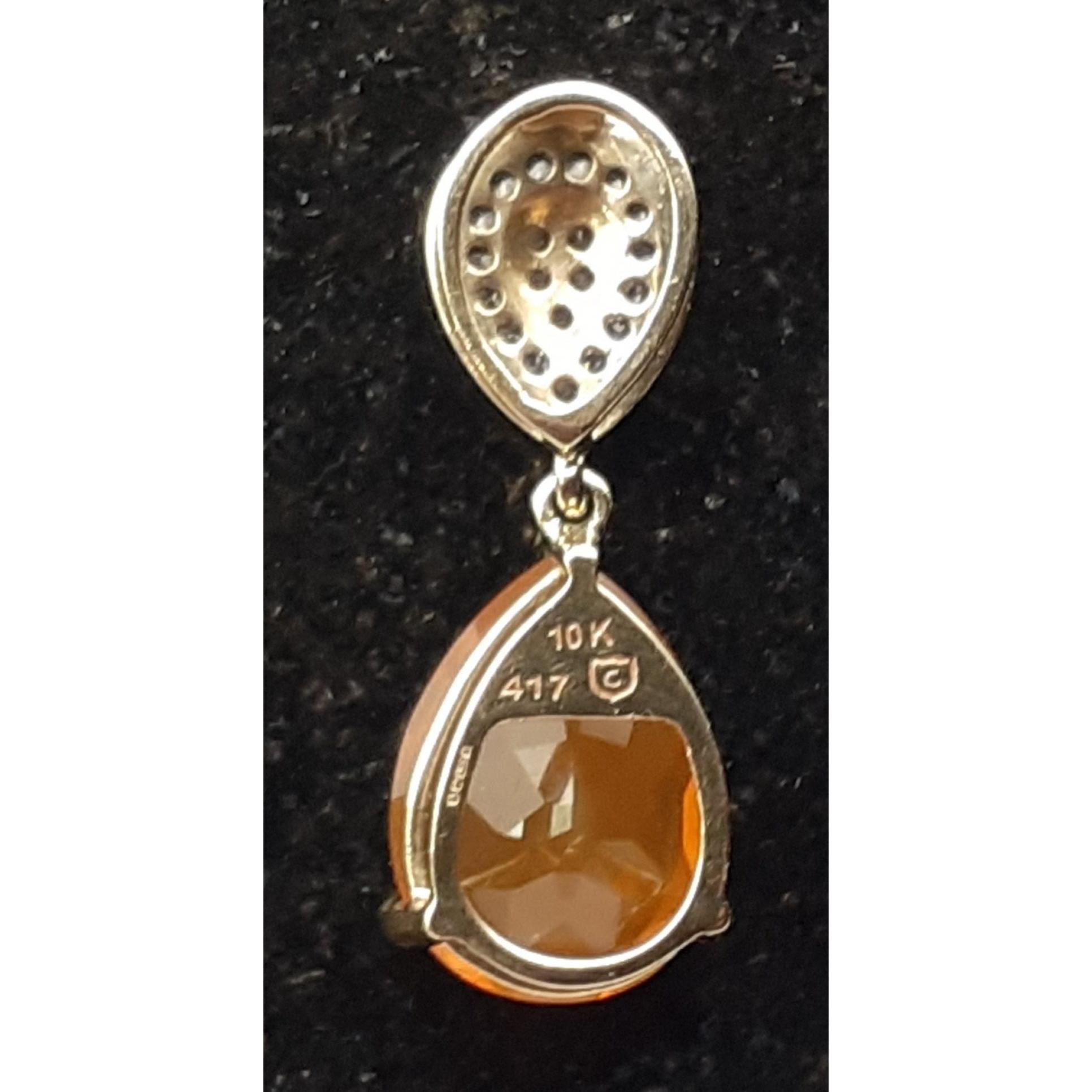A 10k/375 stamped Jaipur Indian ORANGE SPARKLING MADEIRA CITRINE tear-drop stone (stone width 1cm x height 1.5cm approx) pendant with tiny chipped white stones on the link - gross weight 2.98g approx
