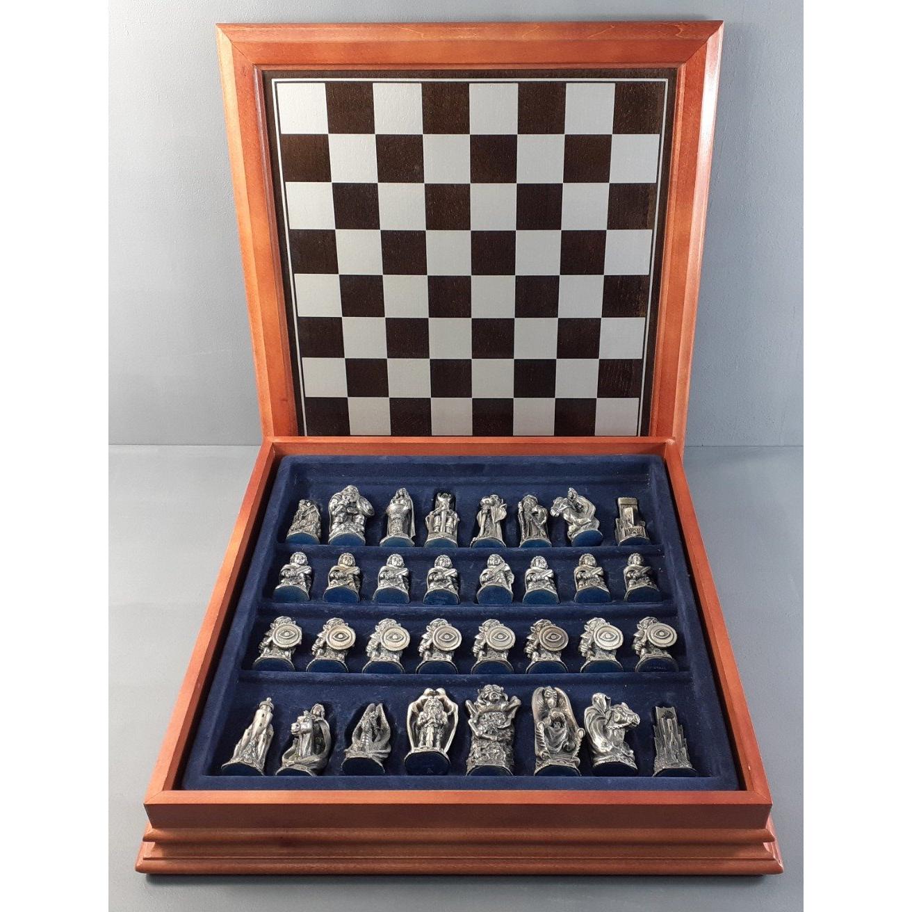 THE LORD OF THE RINGS J R R Tolkien Official FANTASY chess set with PEWTER & SILVER made chess pieces - serial No 3495 - comes complete with chess board - dimensions square 42cm x depth 78cm approx