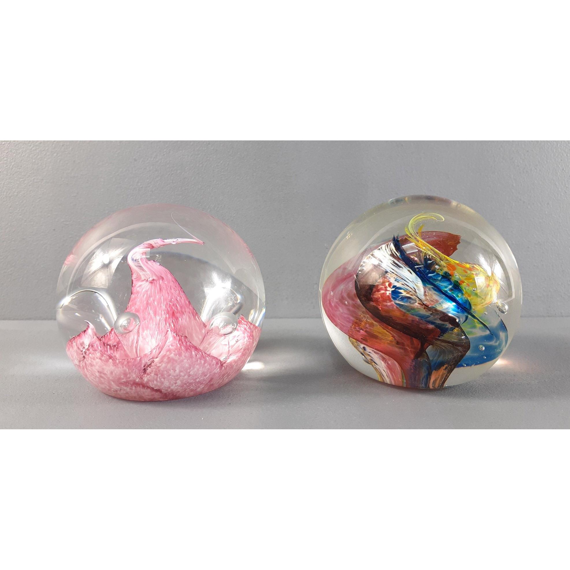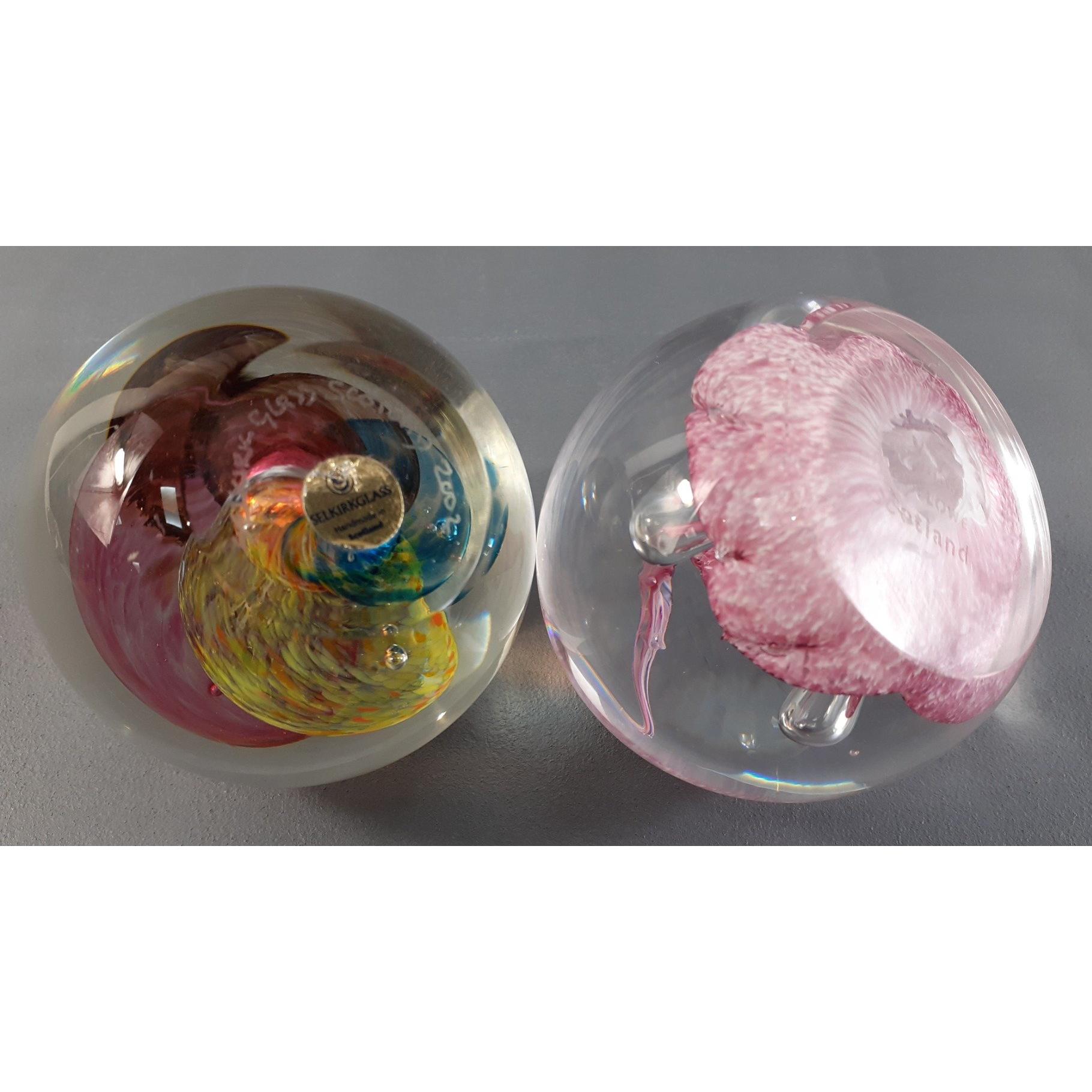 Two glass paper weights - one is SELKIRK GLASS (swirly multi-coloured one) and the other is CAITHNESS GLASS (pink swirly one) - dimensions 9cm diameter x 8cm height approx - both stamped to the base