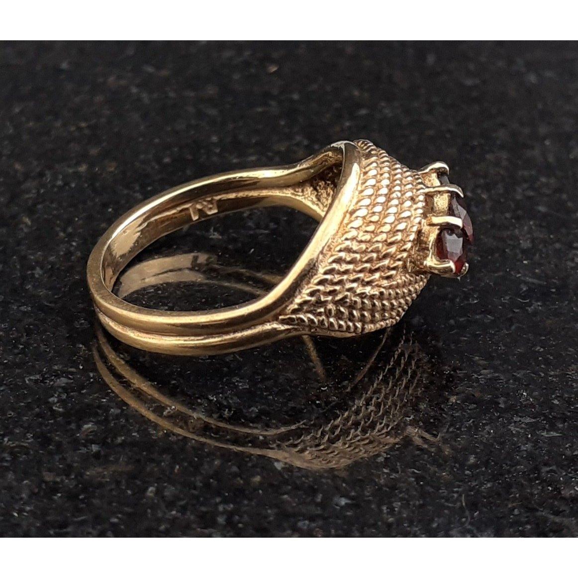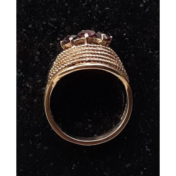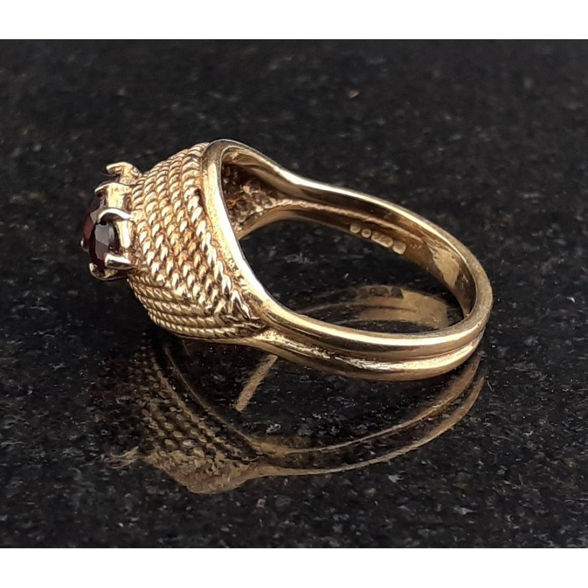 A 375 stamped SUBSTANTIAL ring with 3 raised small round-cut GARNETS - dimension of garnets 0.4cm diameter approx - ring size M - gross weight 3.56g approx