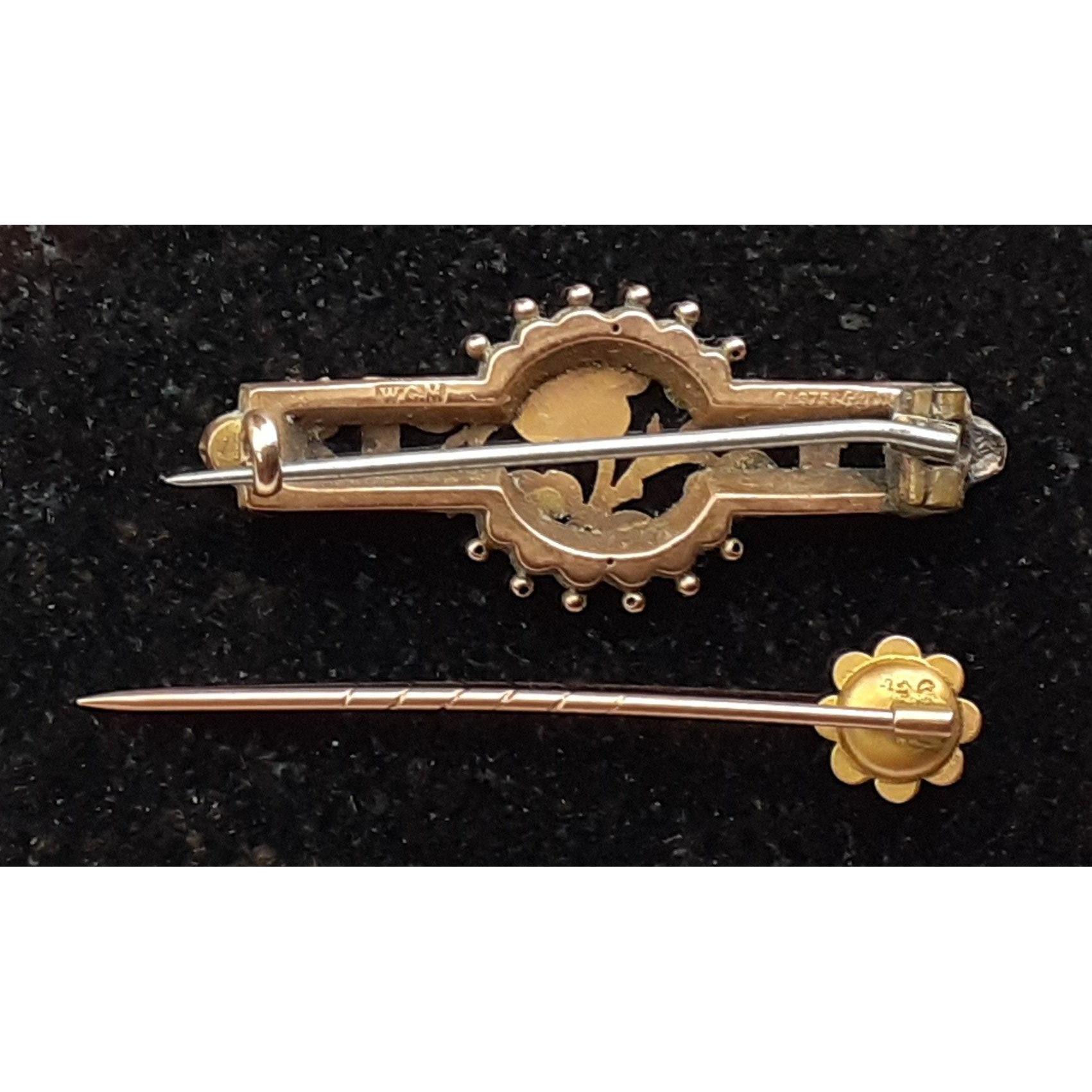 A 375 stamped pin brooch in floral form, gross weight 2.50g approx with also a 9ct stamped tie-pin weight 0.7g approxApprox 2 pieces