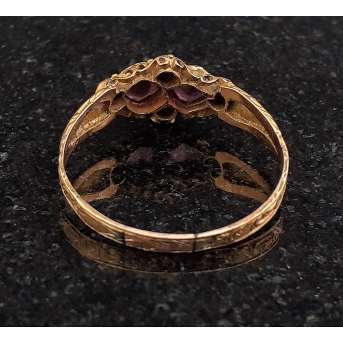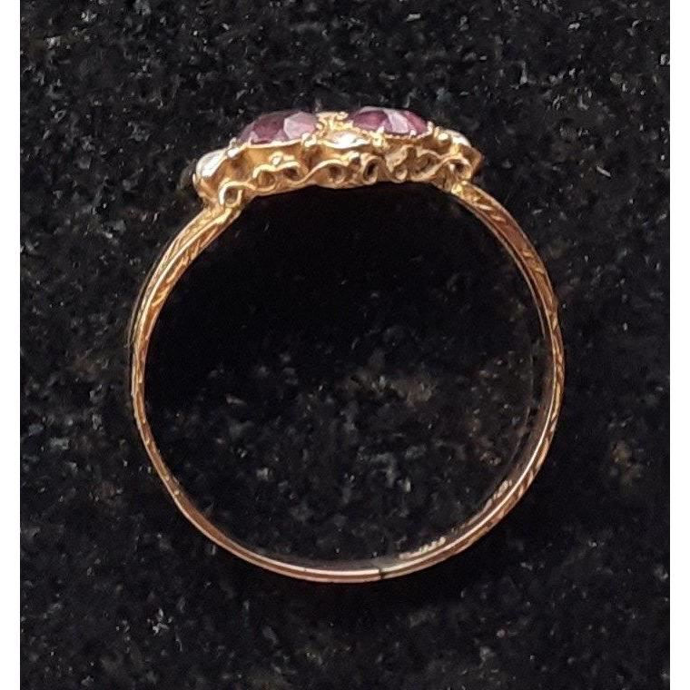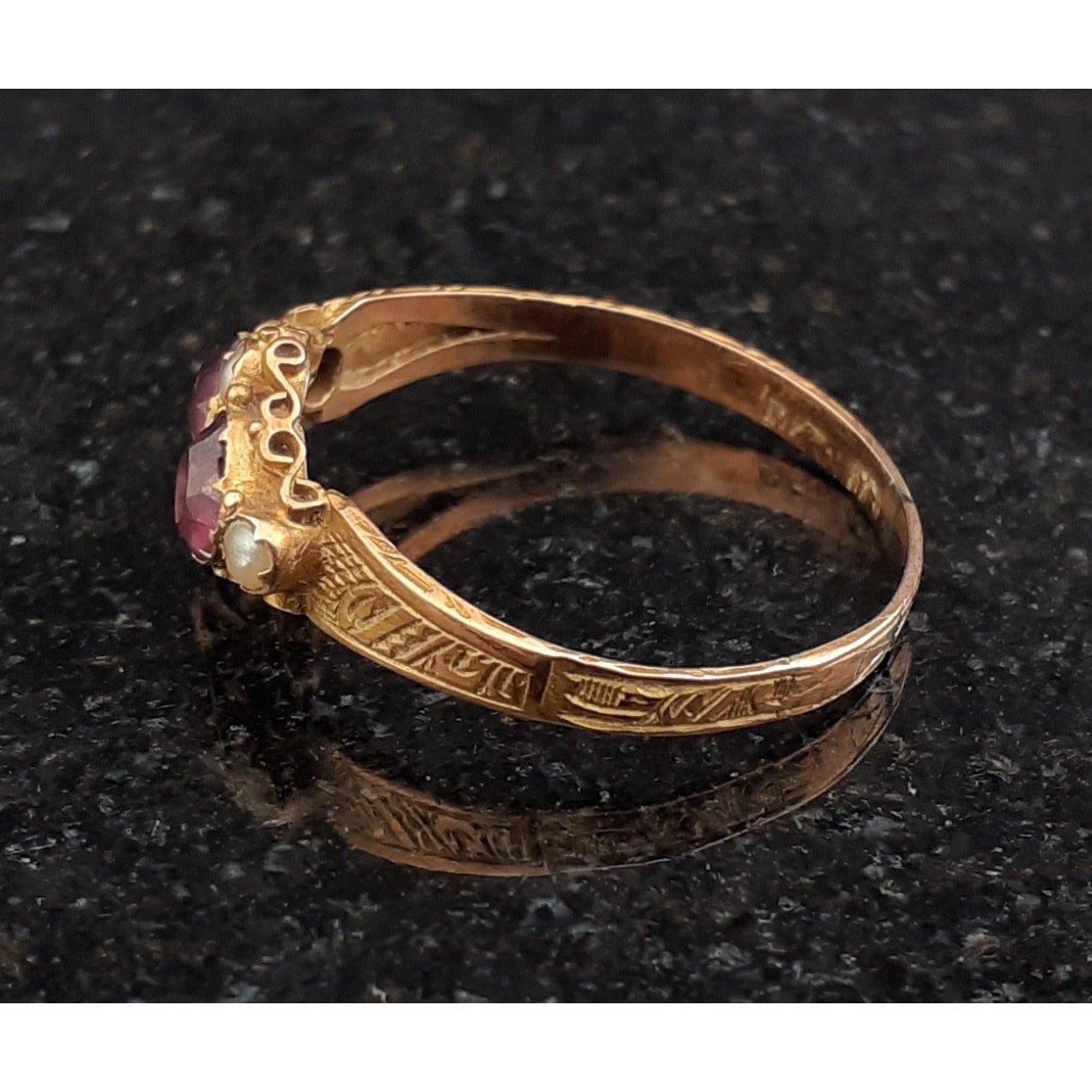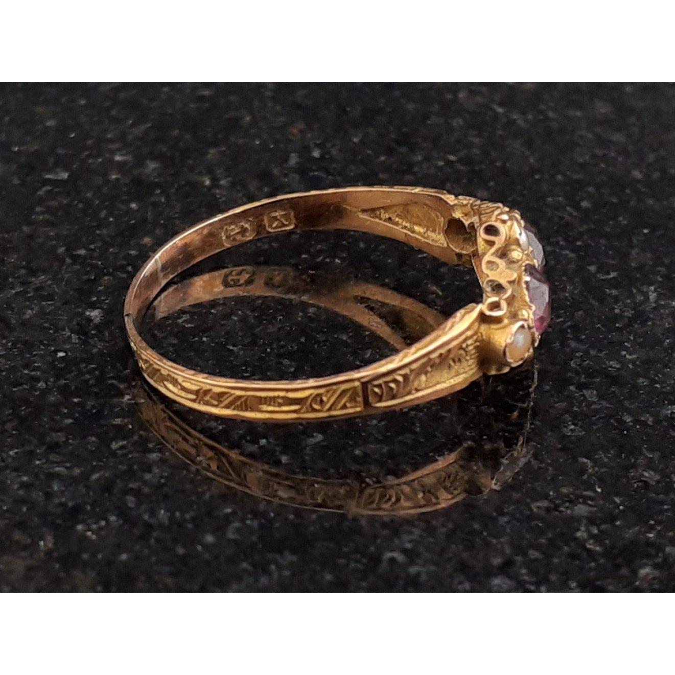 ALMOST REGAL LOOKING! - An indistinct stamped yellow metal ring with pink and pearl like stones - 1st number is clearly '1', then 2nd letter is unclear - ring size Q - gross weight 1.25g approx