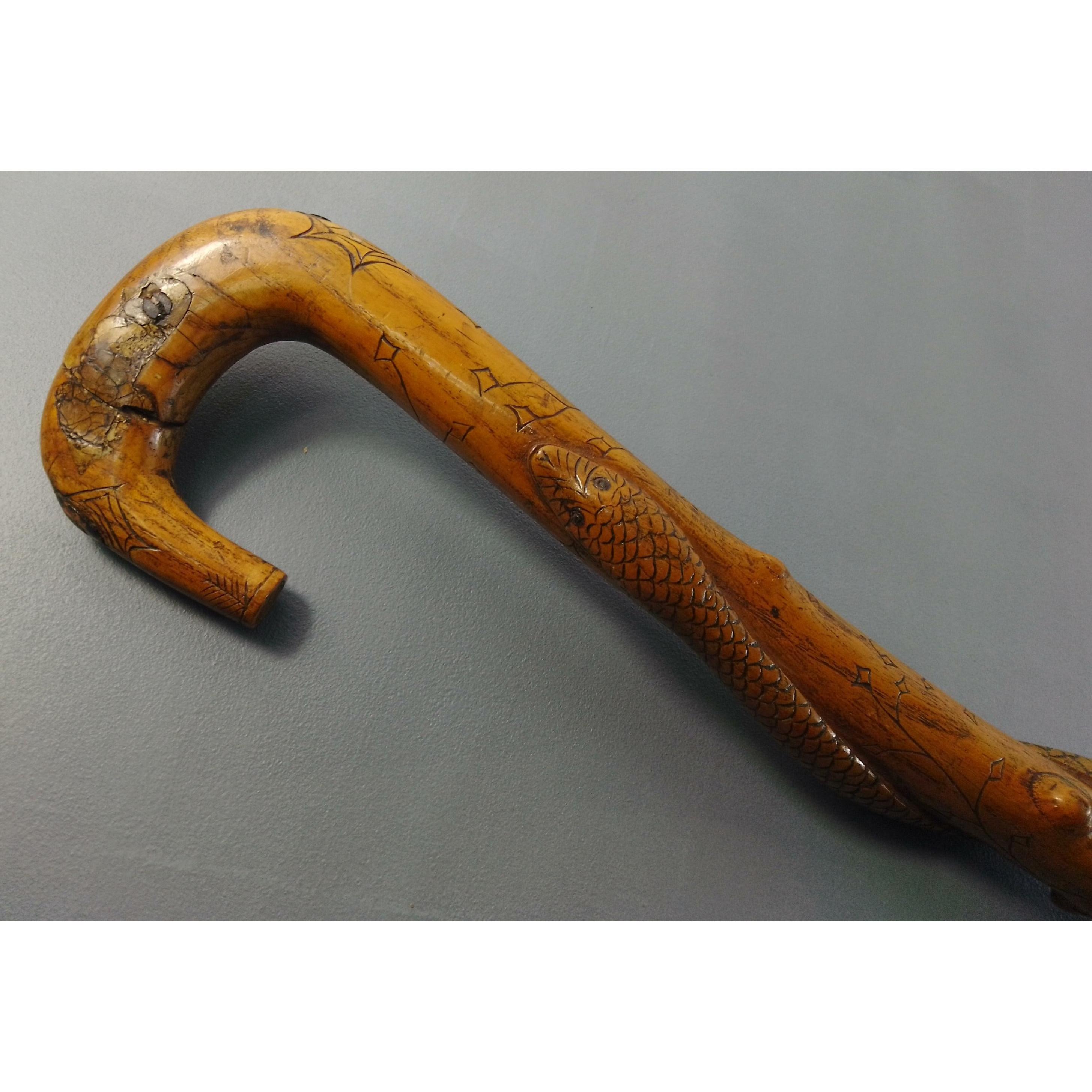 An INTERESTING hand carved wooden snake or serpent walking stick - length 38" approx