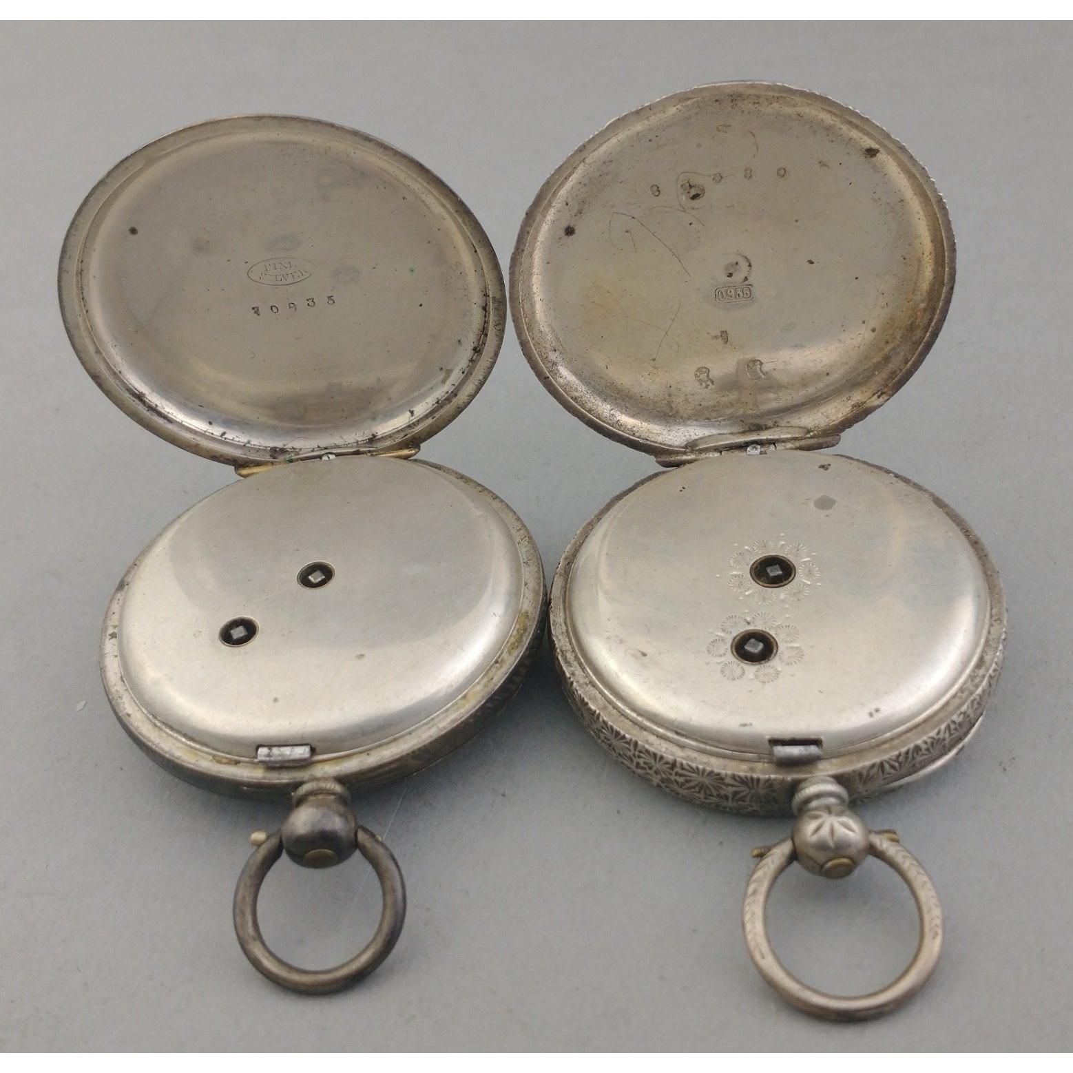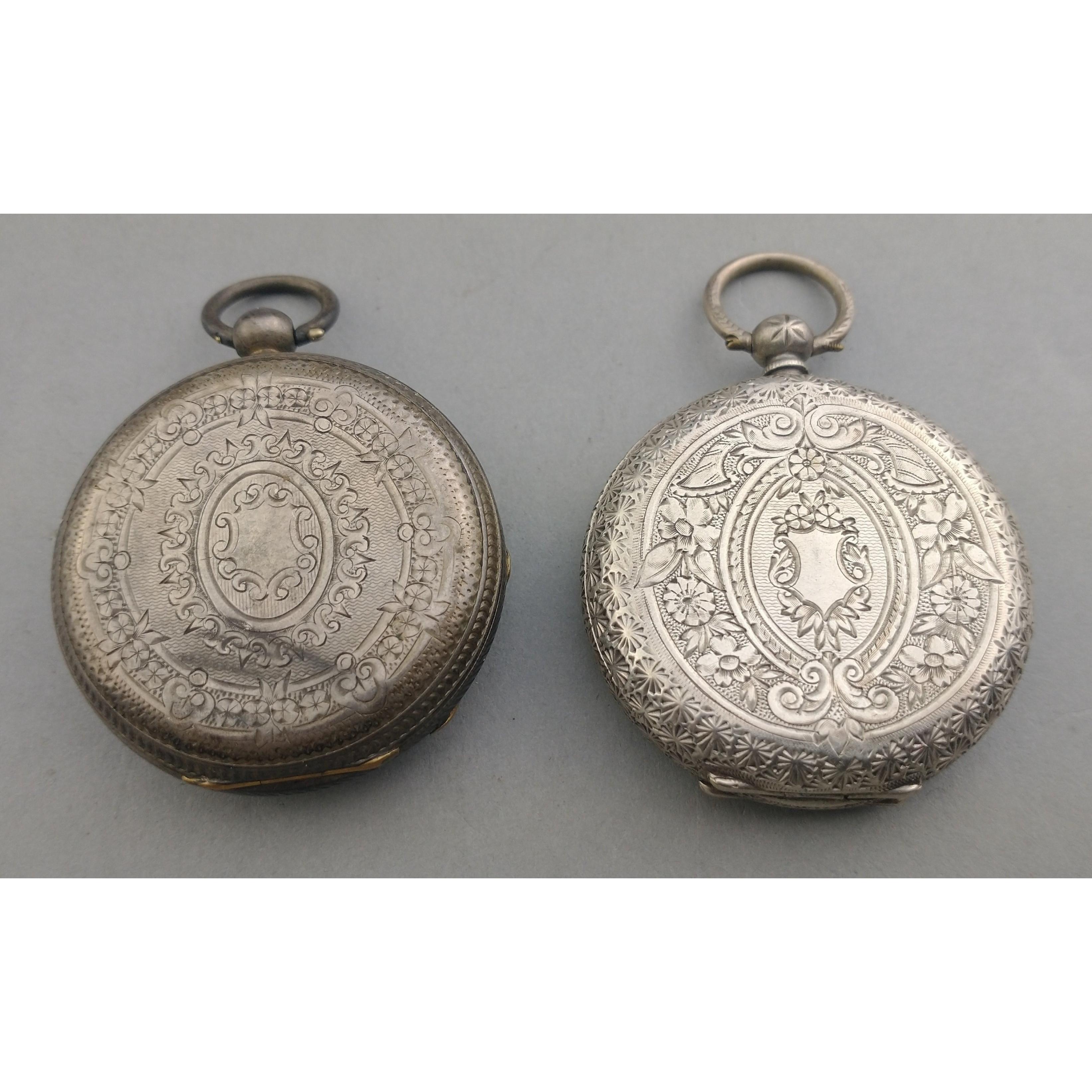 Two continental silver pocket watches one with gilt highlights missing its glass. Face diameters 4cm approxApprox 2 pieces