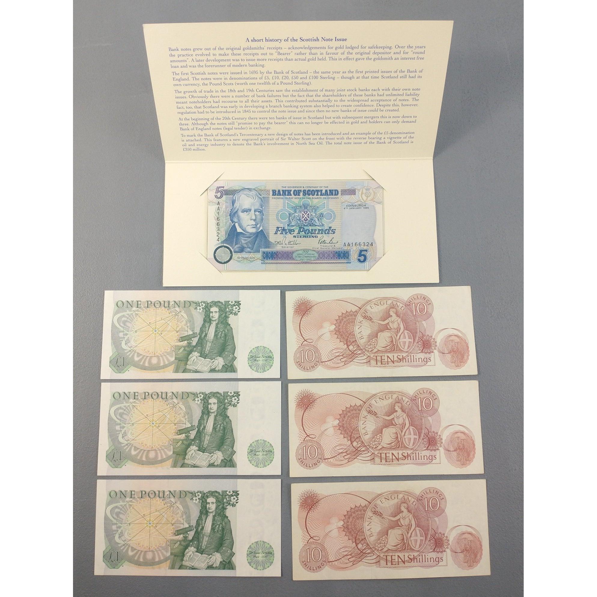 BANK OF SCOTLAND 1995 Presentation £5 Banknote in folder. First issue AA note. Also three BoE Ten Shilling sequential Fforde notes, comes with three BoE £1 sequential notes. A nice little group all in good clean crisp order.