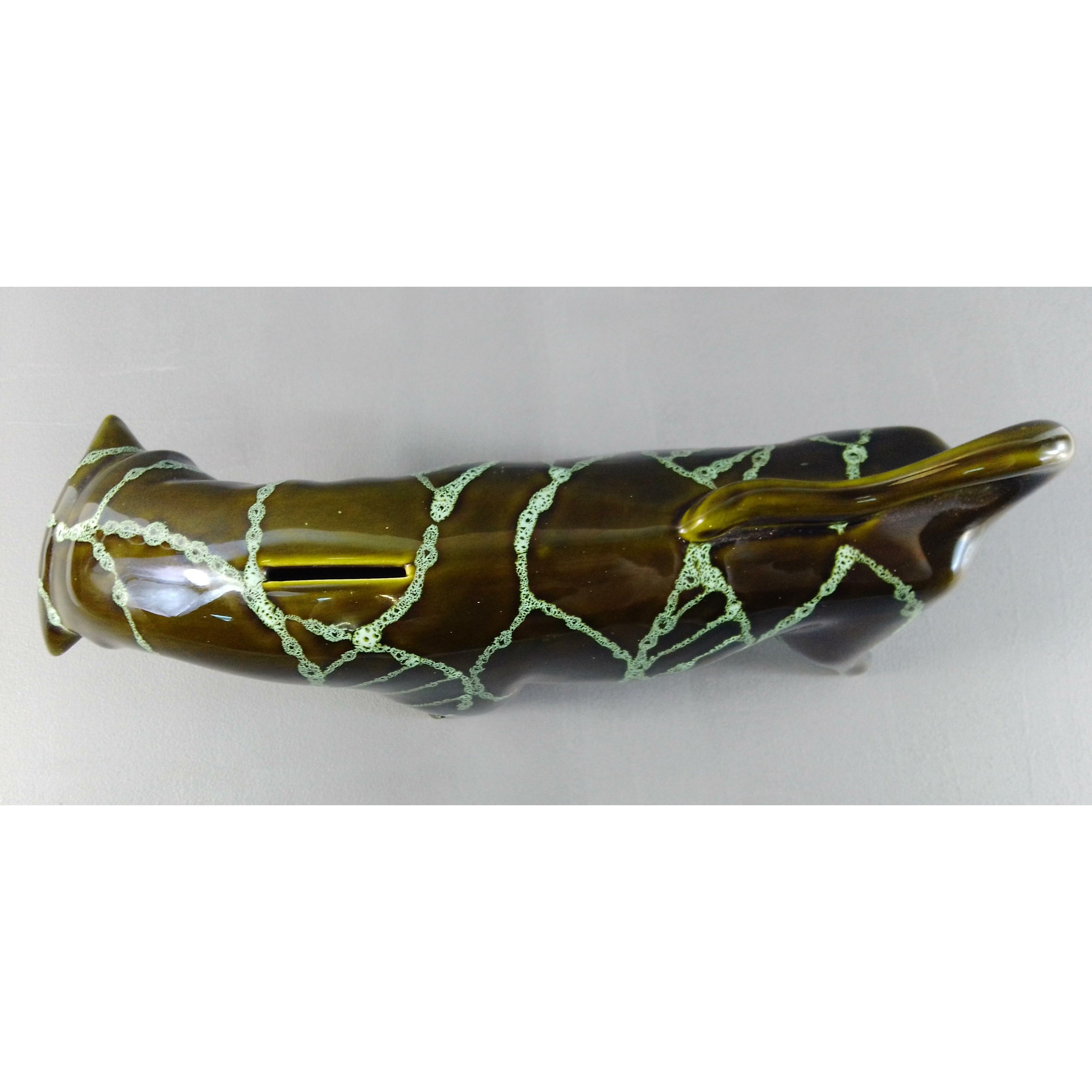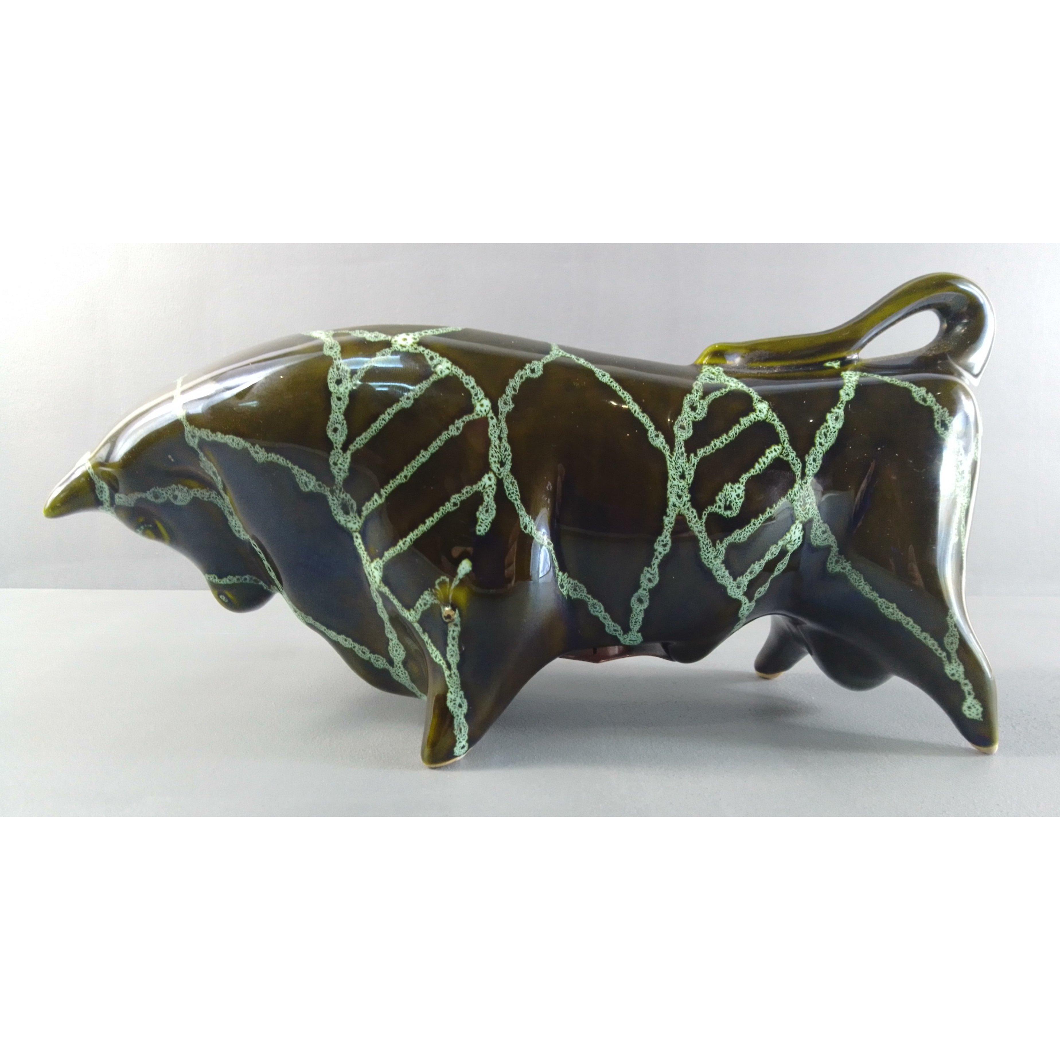 A vintage TRENTHAM artware green bull money bank by Colin Melbourne - dimensions 30cm length x 15cm height x 7cm approx - no chips cracks or signs of damage repair