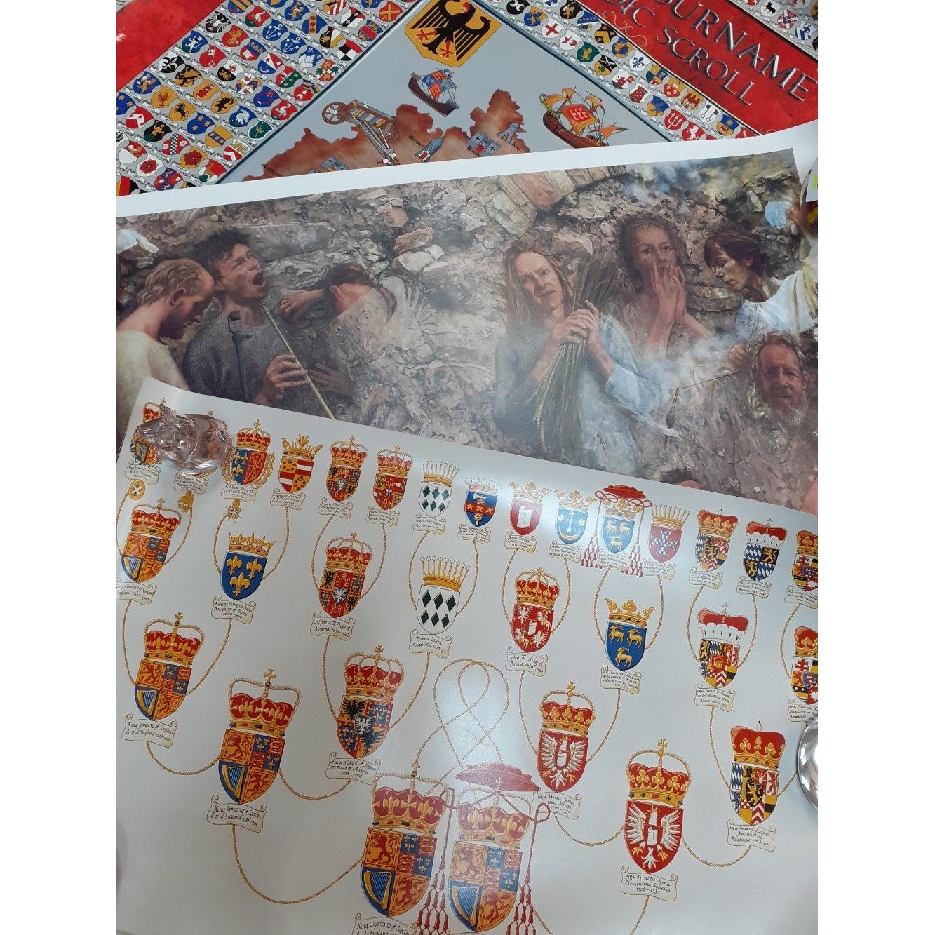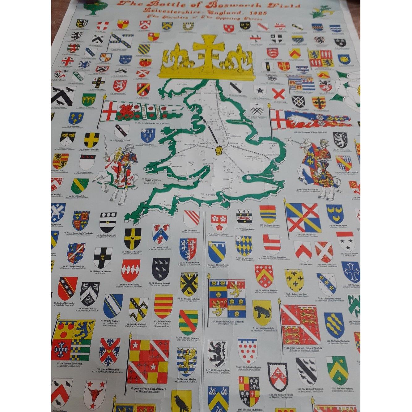 An interesting quantity of heraldic posters some dating back to the 1970s including maps of German surnames, and an interesting map of Bosworth field with the heraldry of the opposing forces